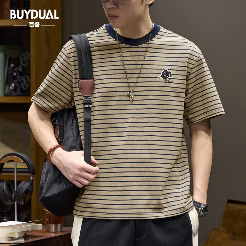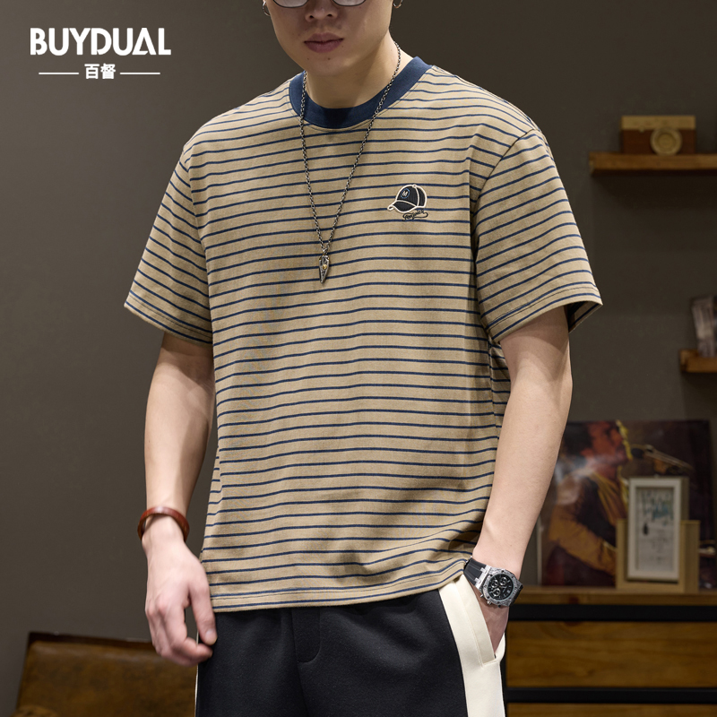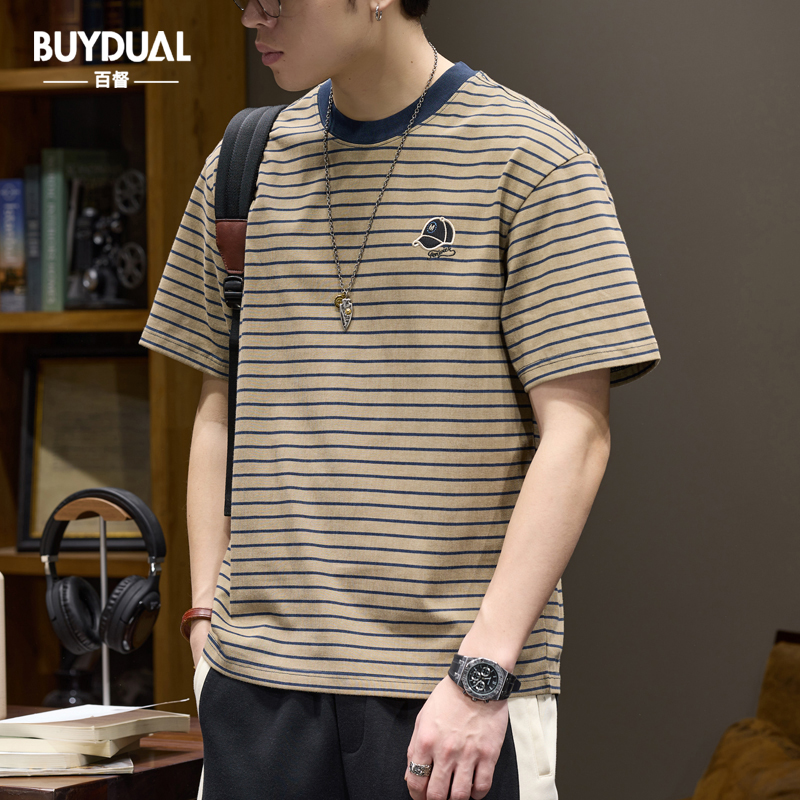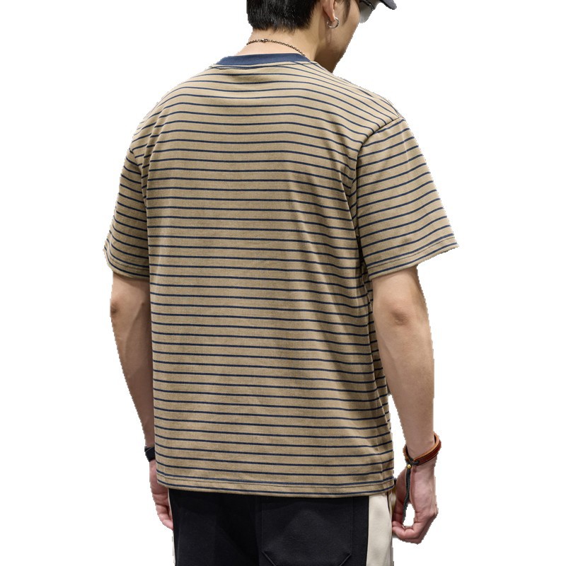 Главная страница > Повседневная и универсальная мужская футболка в тонкую полоску с короткими рукавами, летняя новая повседневная футболка с рваным воротником в стиле ретро контрастного цвета