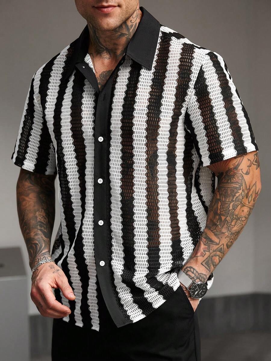 Главная страница > 2025 Трансграничные Горячие продажи Мужские черные белые полосатые рубашки с короткими рукавами повседневные топы