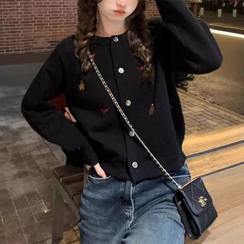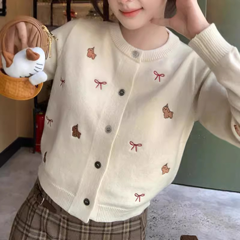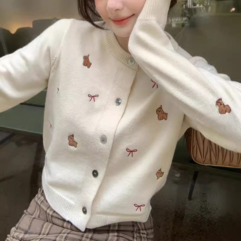 Главная страница > Милый и нежный стильный свитер с мультяшной вышивкой в корейском стиле для женщин, осенне-зимний дизайн, универсальный короткий модный вязаный кардиган