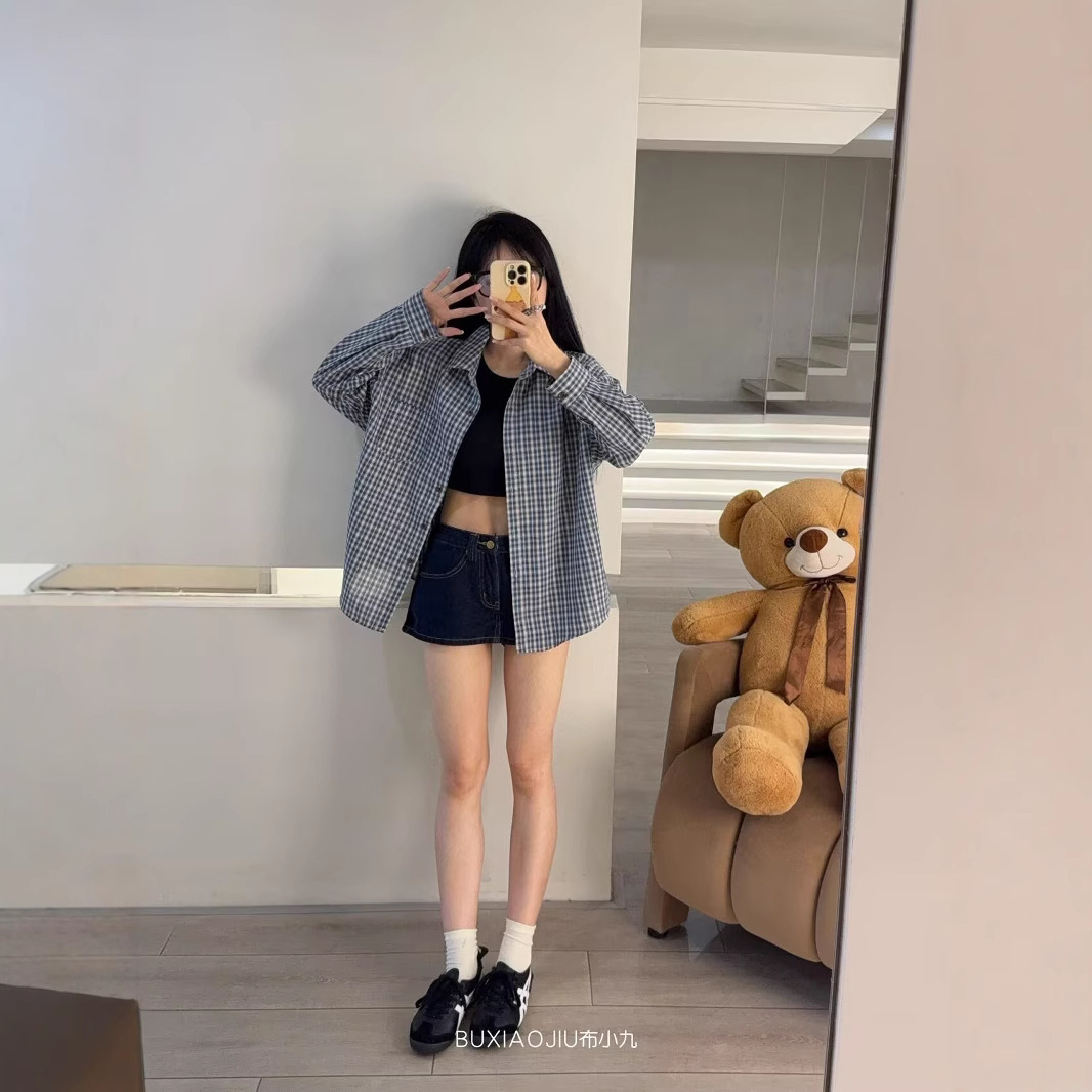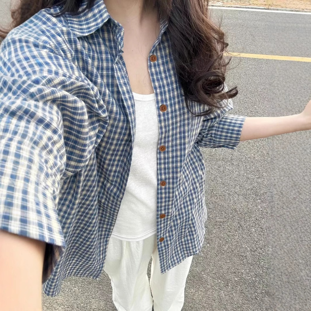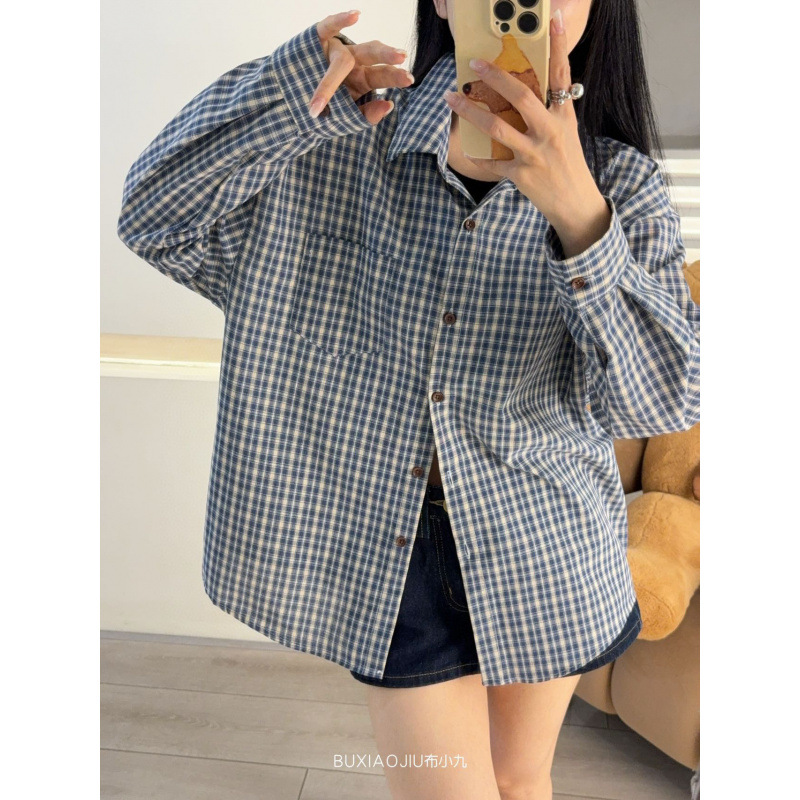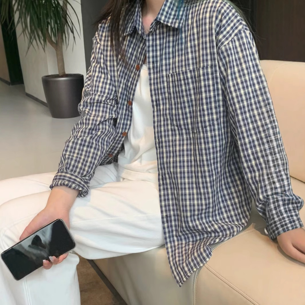Главная страница > Сине-белая клетчатая повседневная клетчатая рубашка с длинными рукавами для женщин, летняя тонкая свободная солнцезащитная рубашка, топ в ленивом стиле, куртка