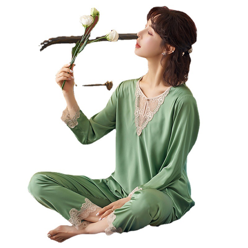 Главная страница > Пижама Женская Весенняя из искусственного шелка пуловер с длинными рукавами из двух предметов кружевная Домашняя одежда ледяной шелк тонкий костюм больших размеров