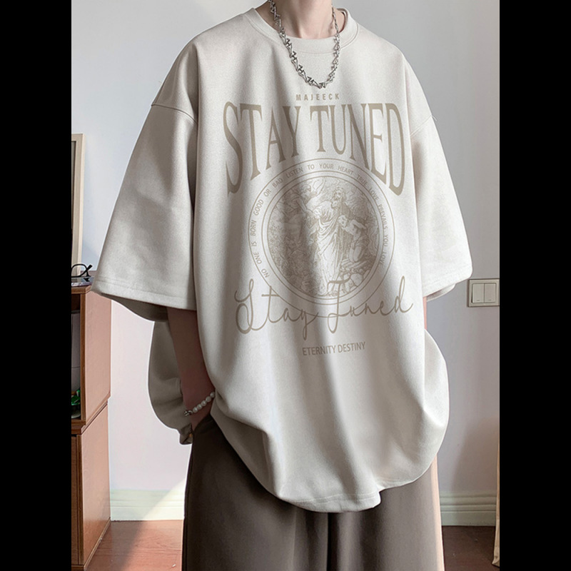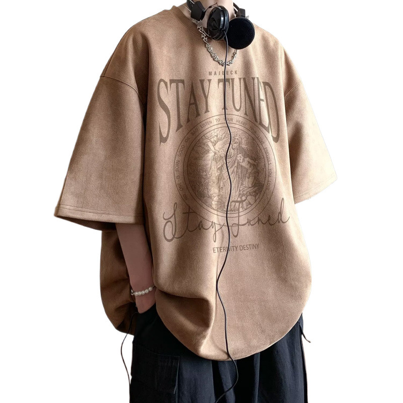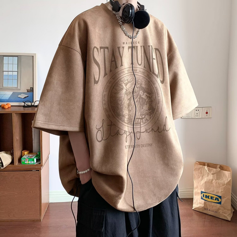 Главная страница > 2025 новый стиль имитация замши с короткими рукавами мужской летний новый американский тяжелый прилив свободная футболка с половиной рукава с пятью рукавами