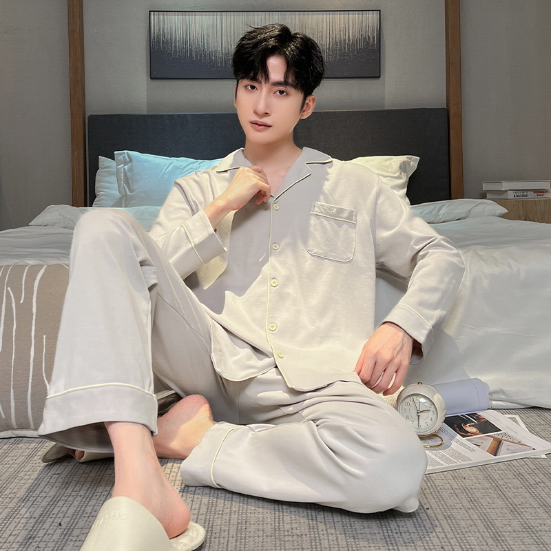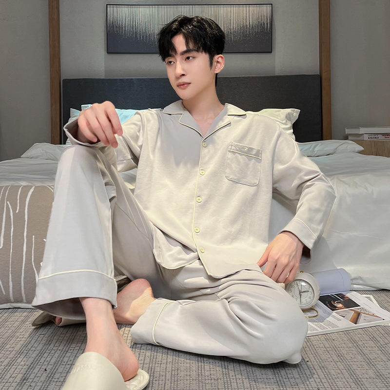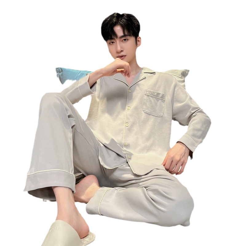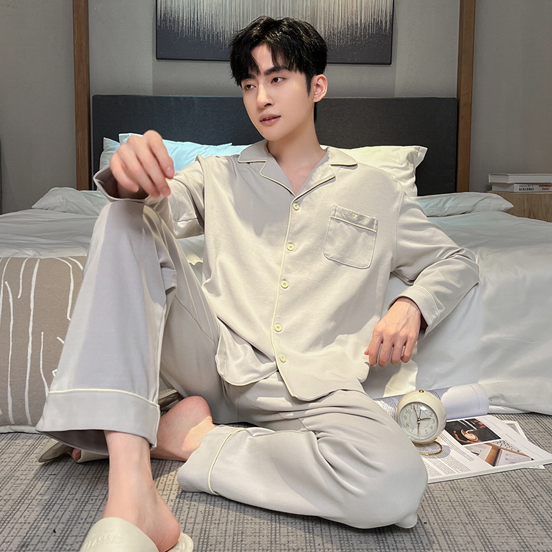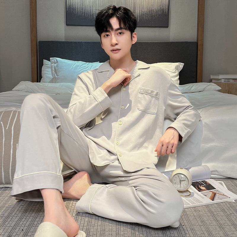 Главная страница > 2024 Мужская пижама весна-осень тонкие брюки с длинными рукавами кардиган простая Домашняя одежда пуловер Костюм Повседневный из чистого хлопка