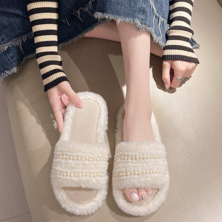 2024 осень новые корейские перламутровые шерстяные тапочки женские наружные плюшевые буксирные домашние хлопчатобумажные тапочки оптом