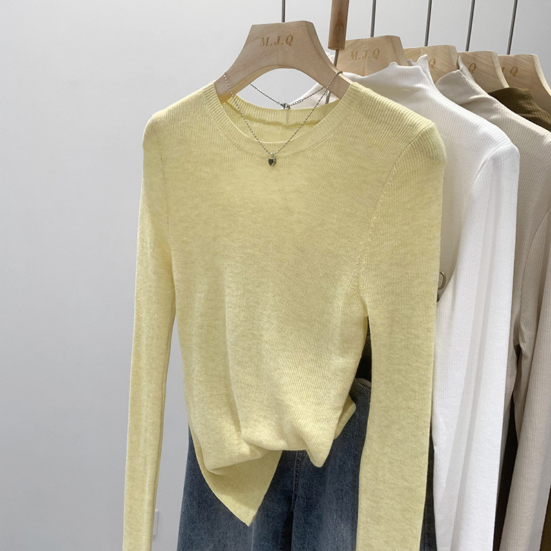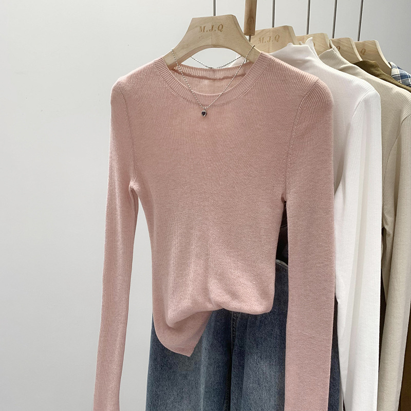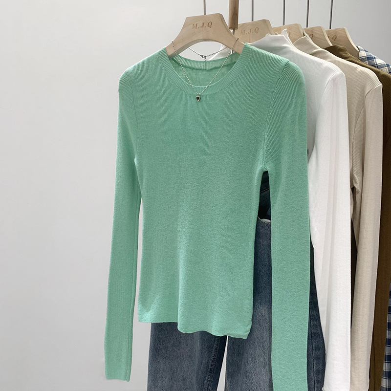 Кондитерский цвет мяты с зеленым круглым вырезом трикотажная нижняя рубашка женская весенняя и осенняя стройная модель с длинными рукавами