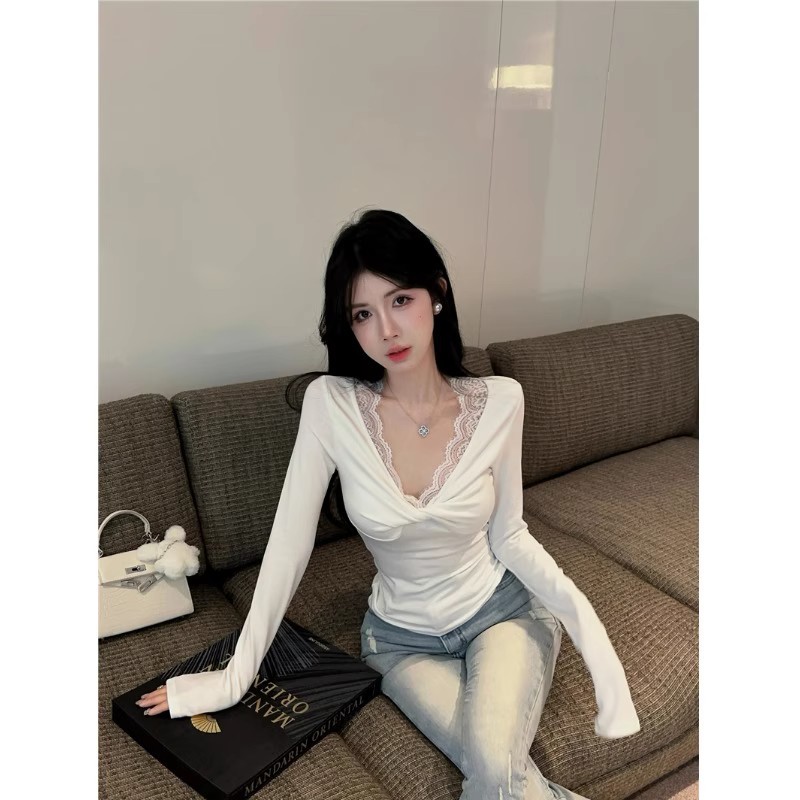 Главная страница > Чистая горячая девушка футболка женская осень-зима кружевная сексуальная с низким вырезом с длинным рукавом топ корейская белая внутренняя рубашка