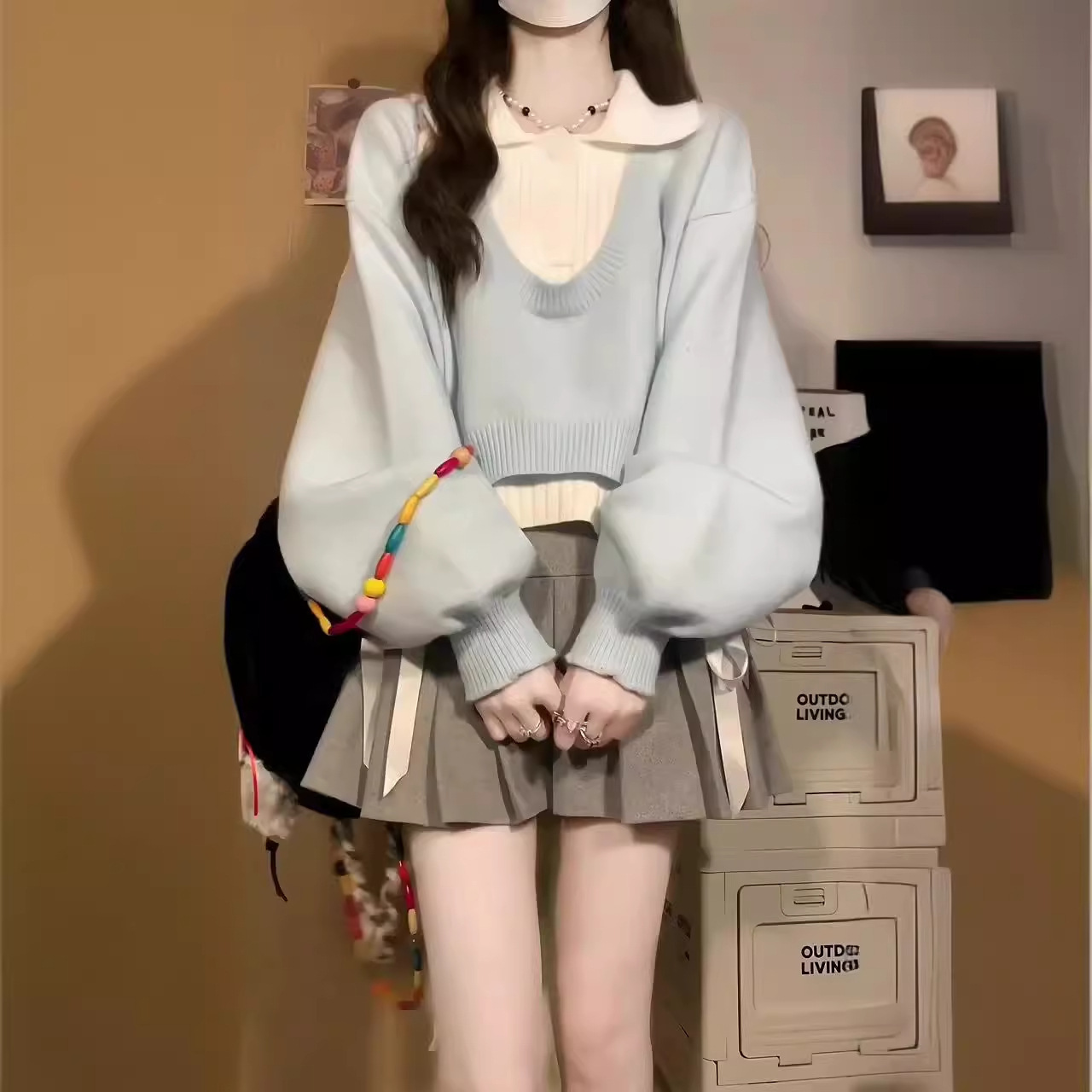 Новый осенний костюм 2025 года, корейский стиль, преппи, трикотаж из двух предметов, топ с воротником-поло, пуловер, трикотаж