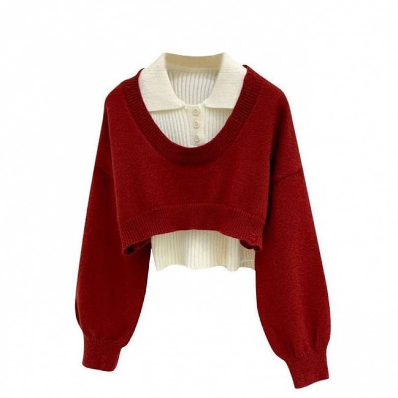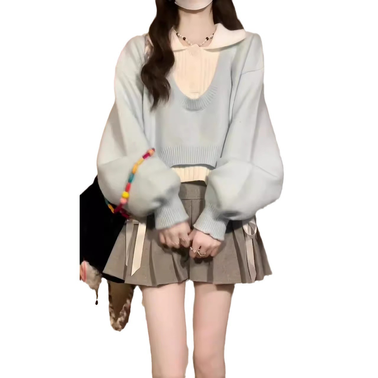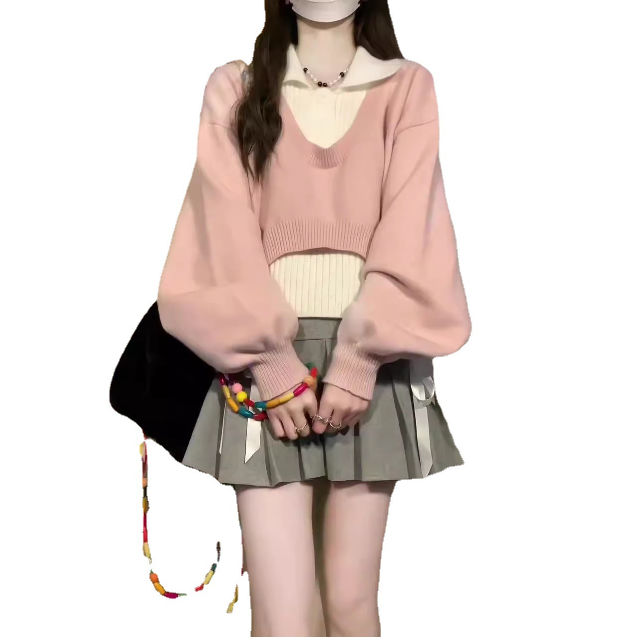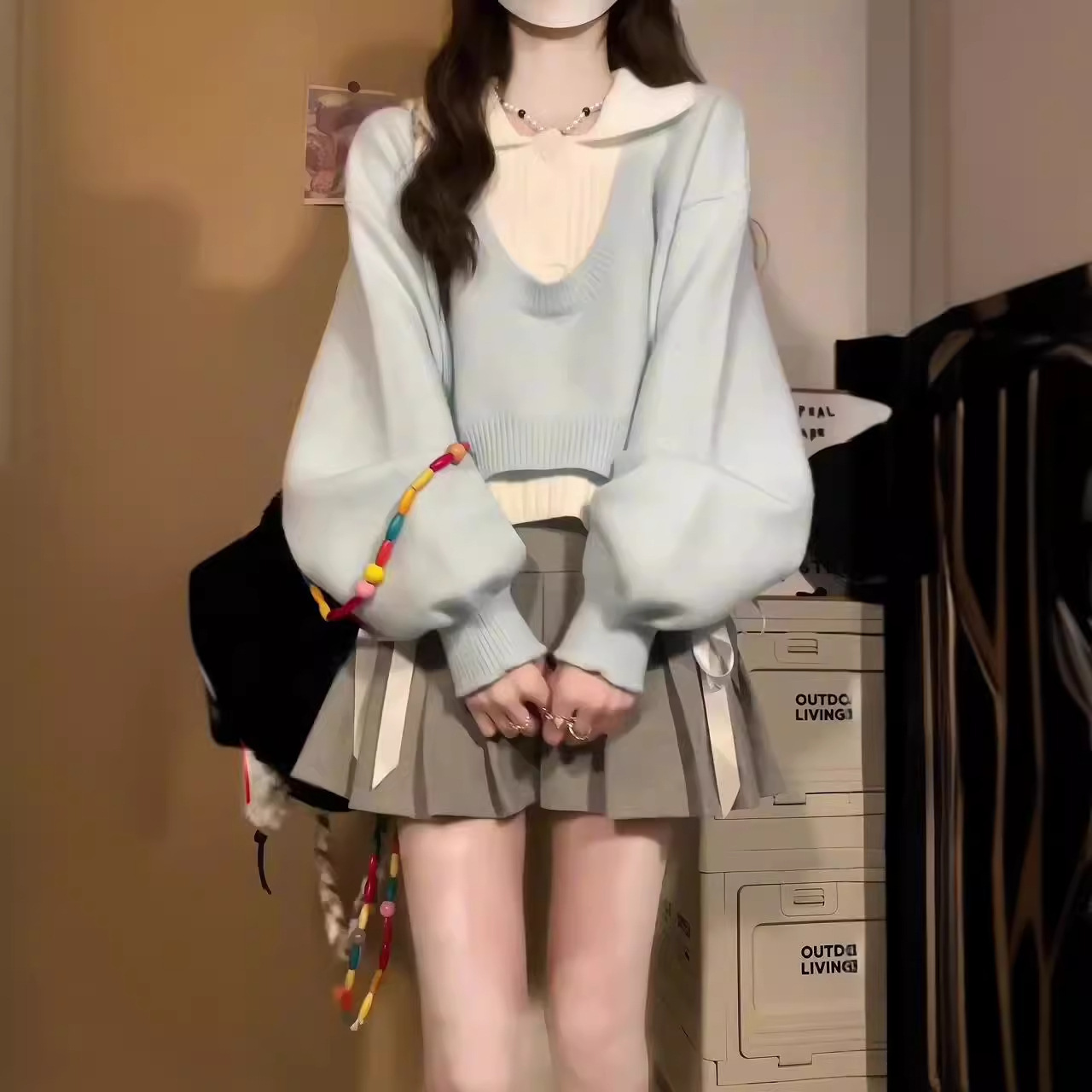 Главная страница > Новый осенний костюм 2025 года, корейский стиль, преппи, трикотаж из двух предметов, топ с воротником-поло, пуловер, трикотаж