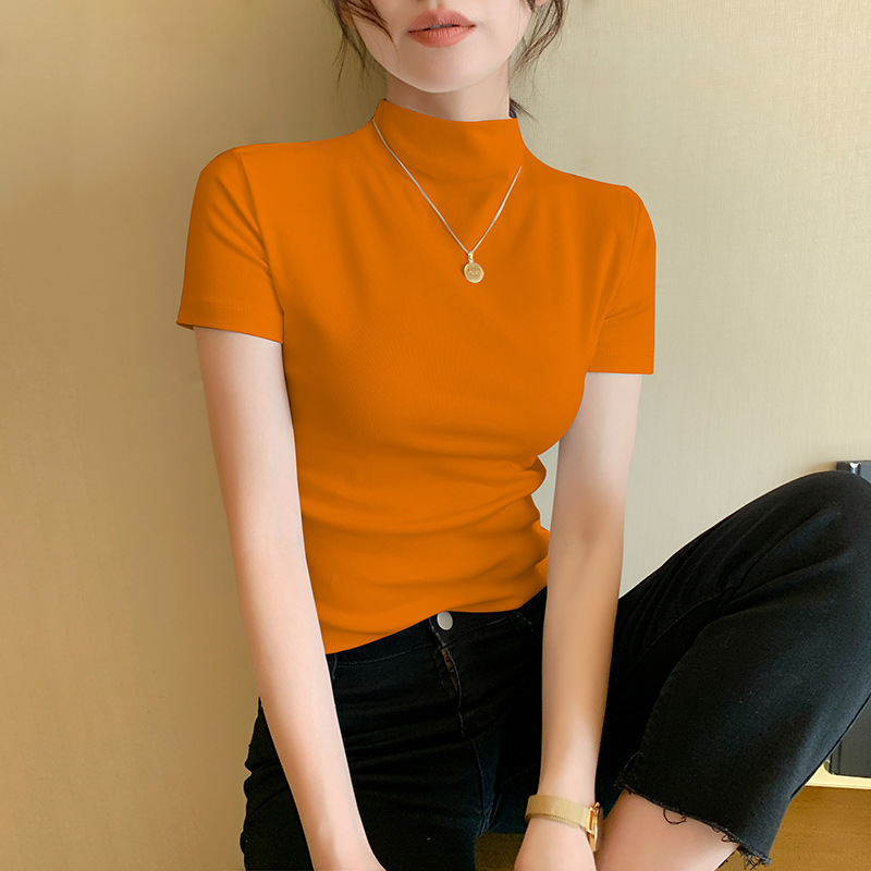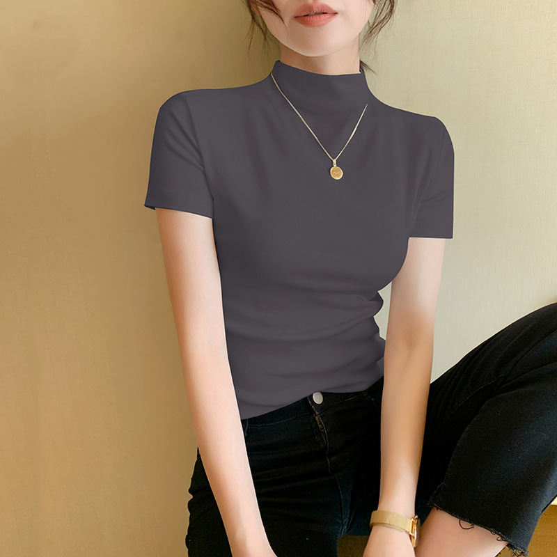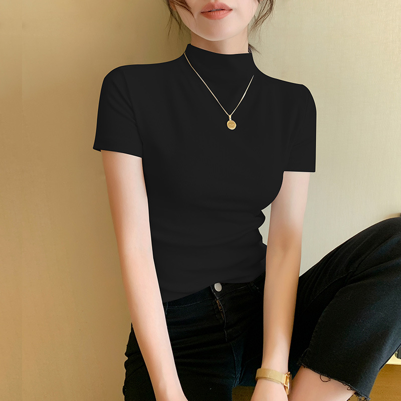 Черная футболка с полугольфом, женская футболка с короткими рукавами, весна и лето, новый стиль, элегантная универсальная футболка с средним воротником, однотонная футболка, модный тонкий топ