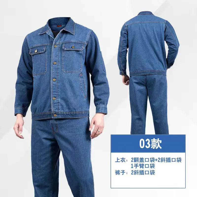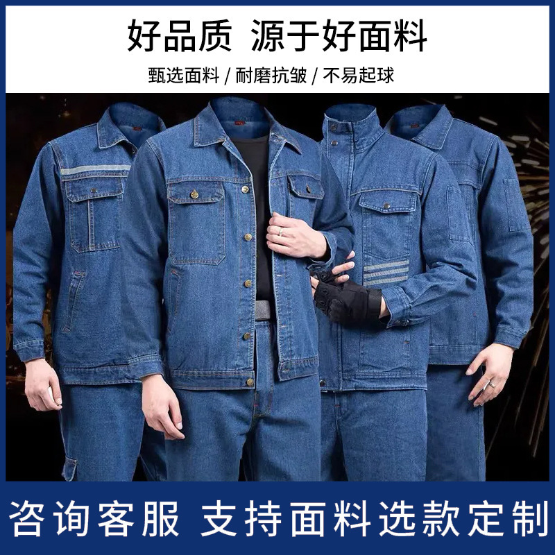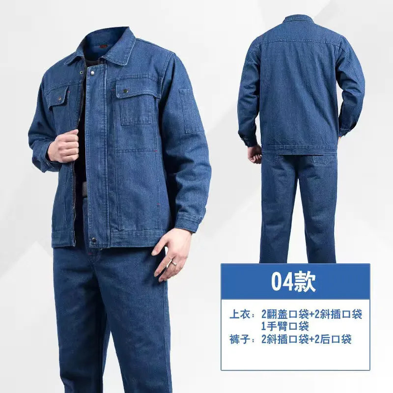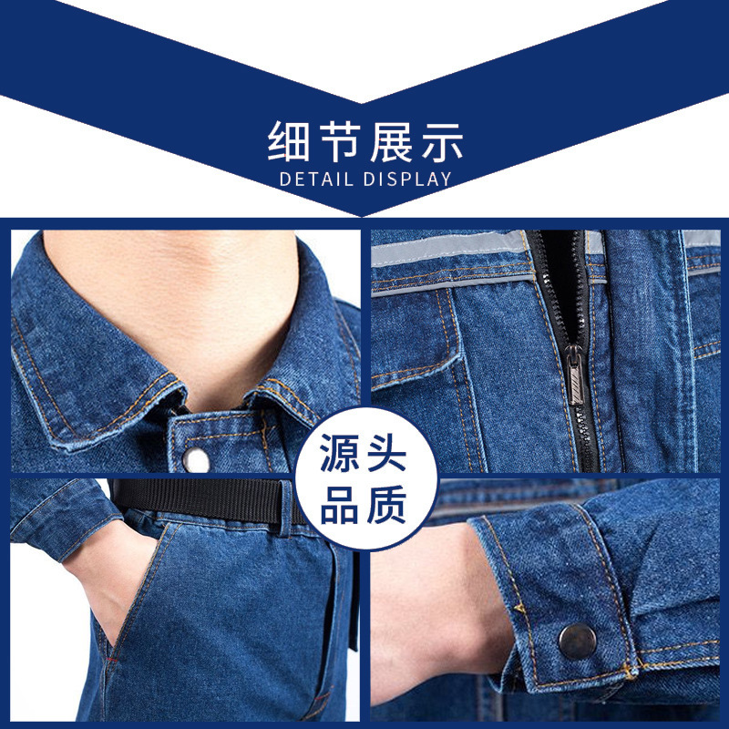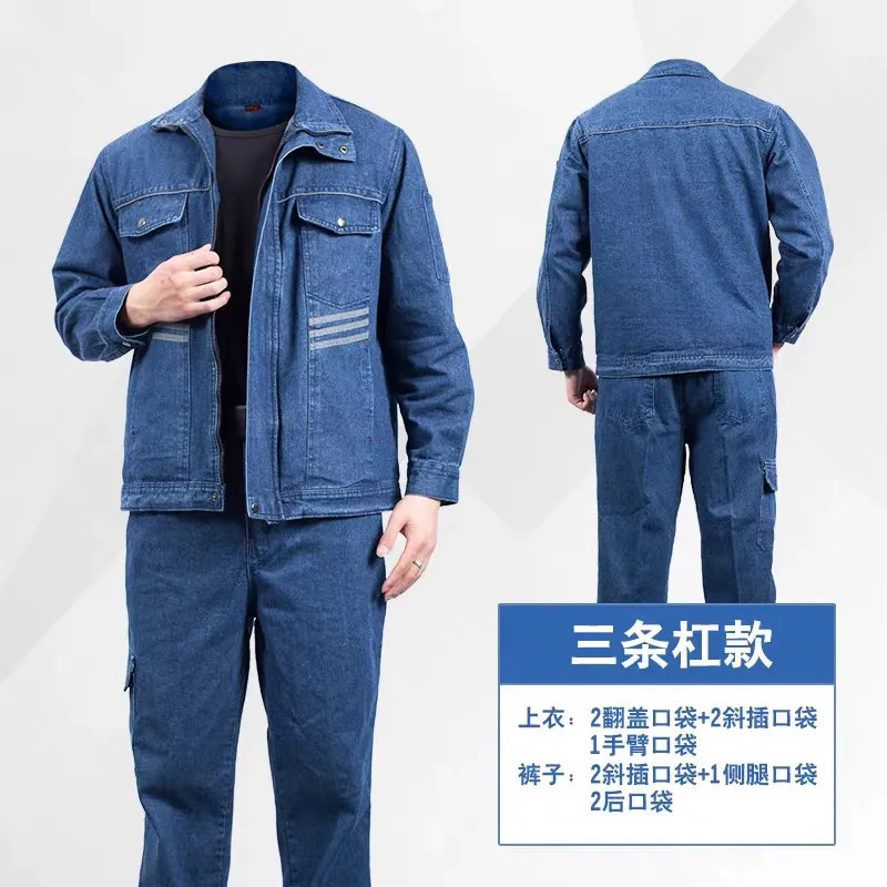 Главная страница > Рабочая одежда для мужчин: джинсовая спецодежда с светоотражающими полосами, защитный костюм с длинными рукавами для стройплощадки, износостойкая рабочая одежда для авторемонта и сварки.