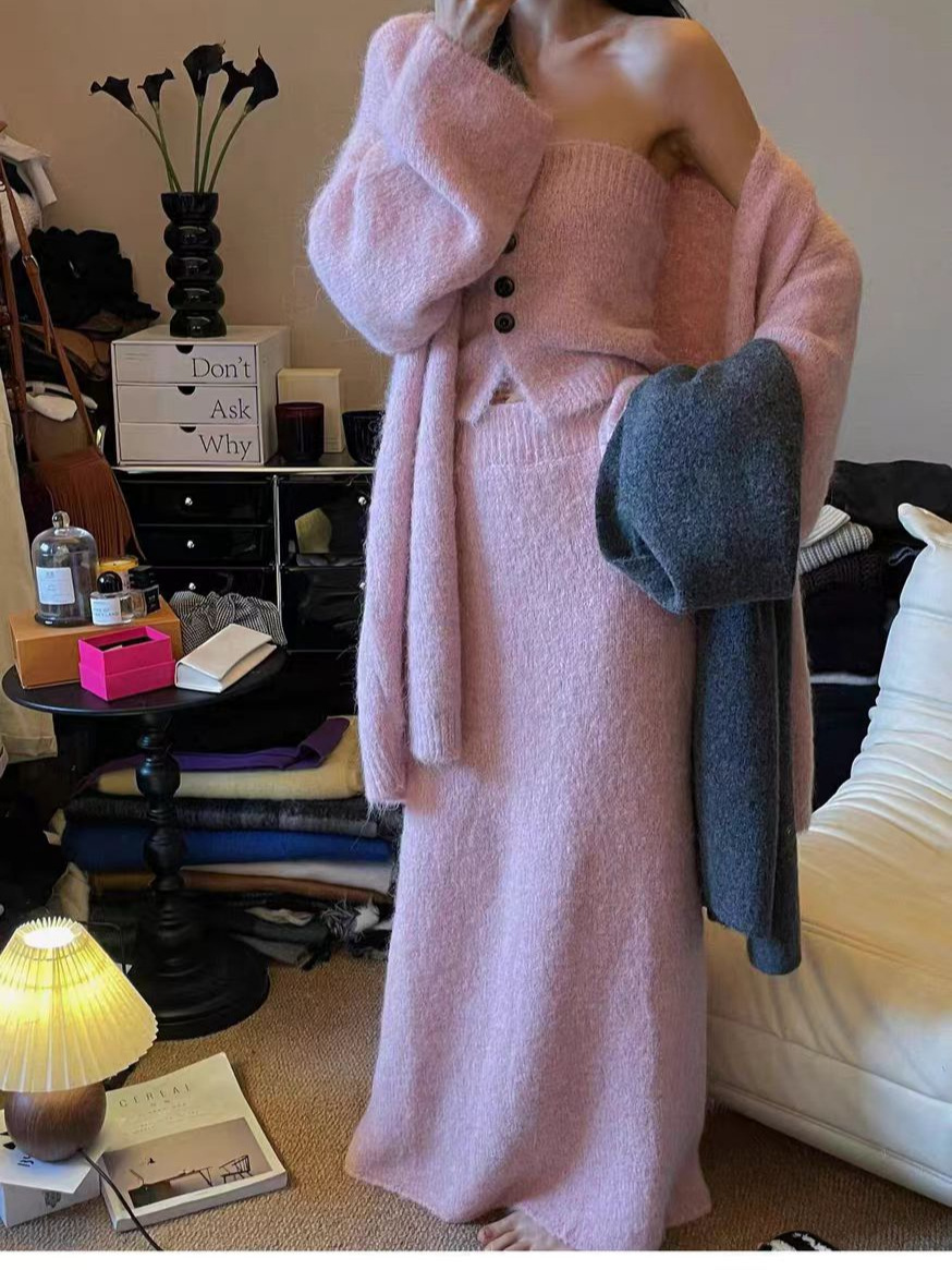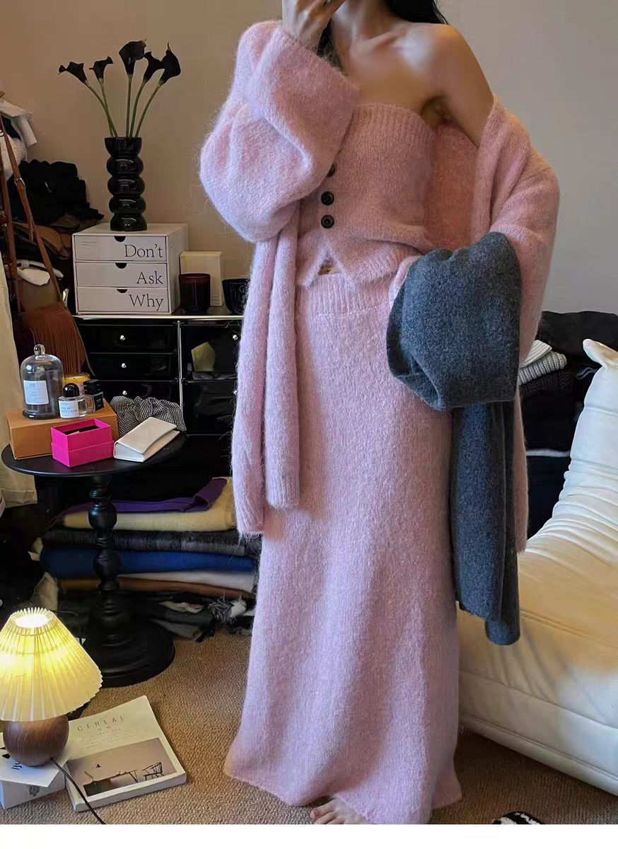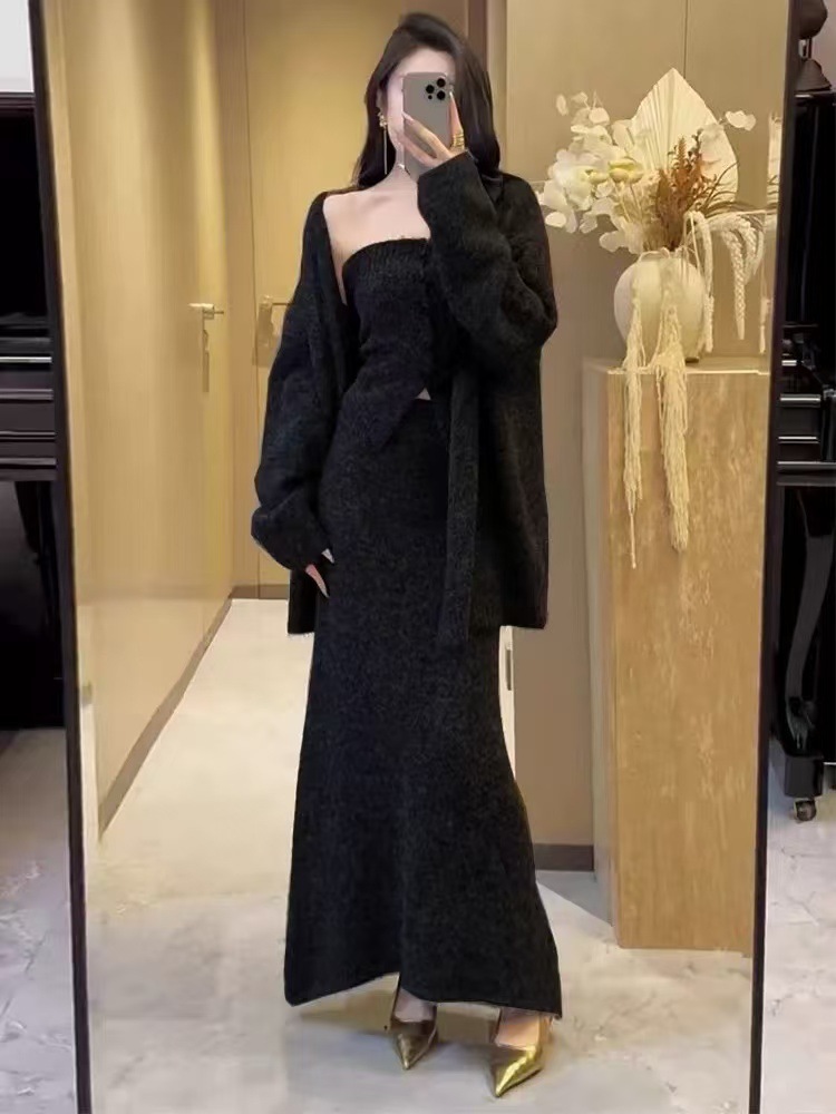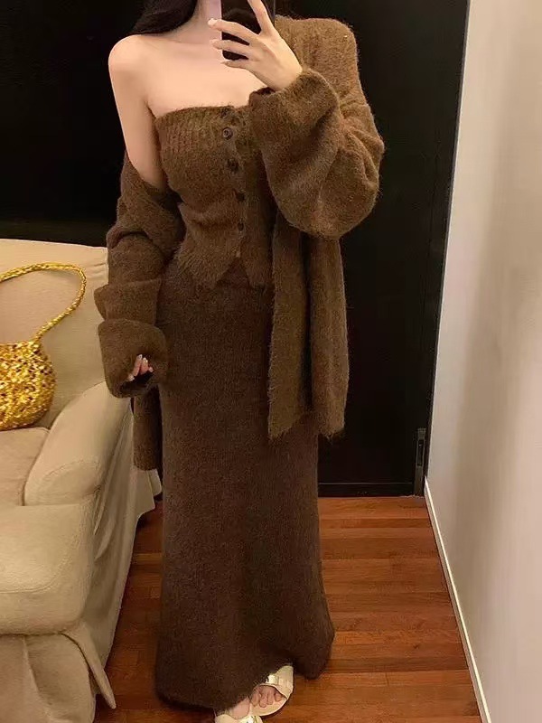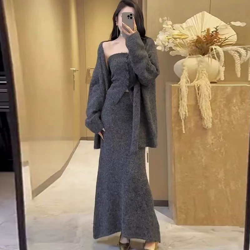 跨境秋冬针织开衫外套女新款慵懒宽松高级感毛衣抹胸半身裙三件套