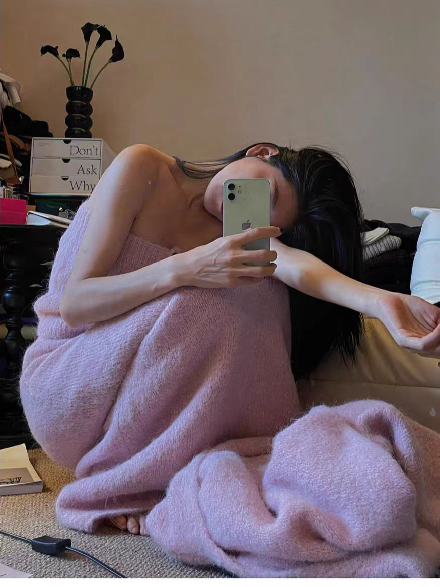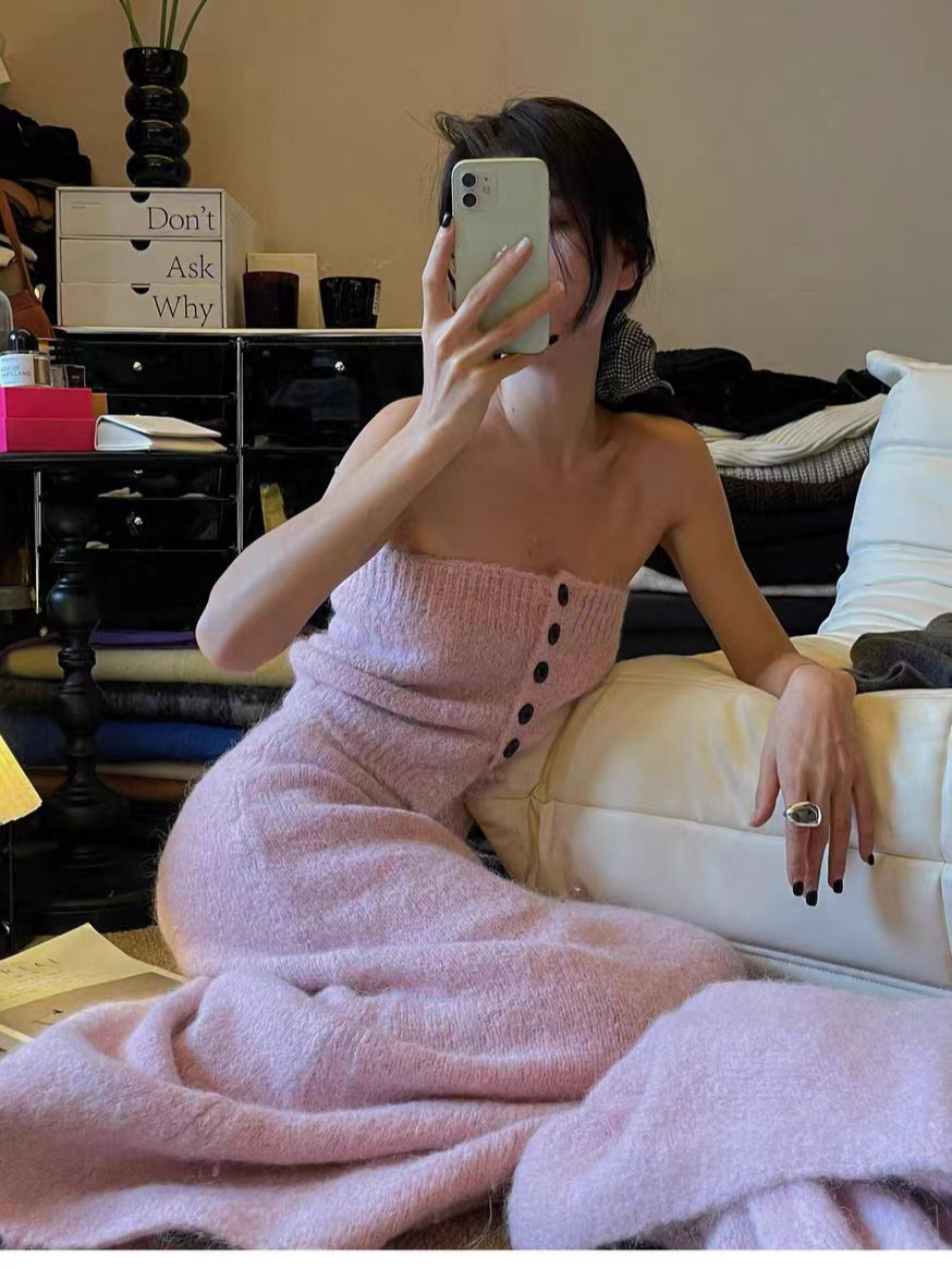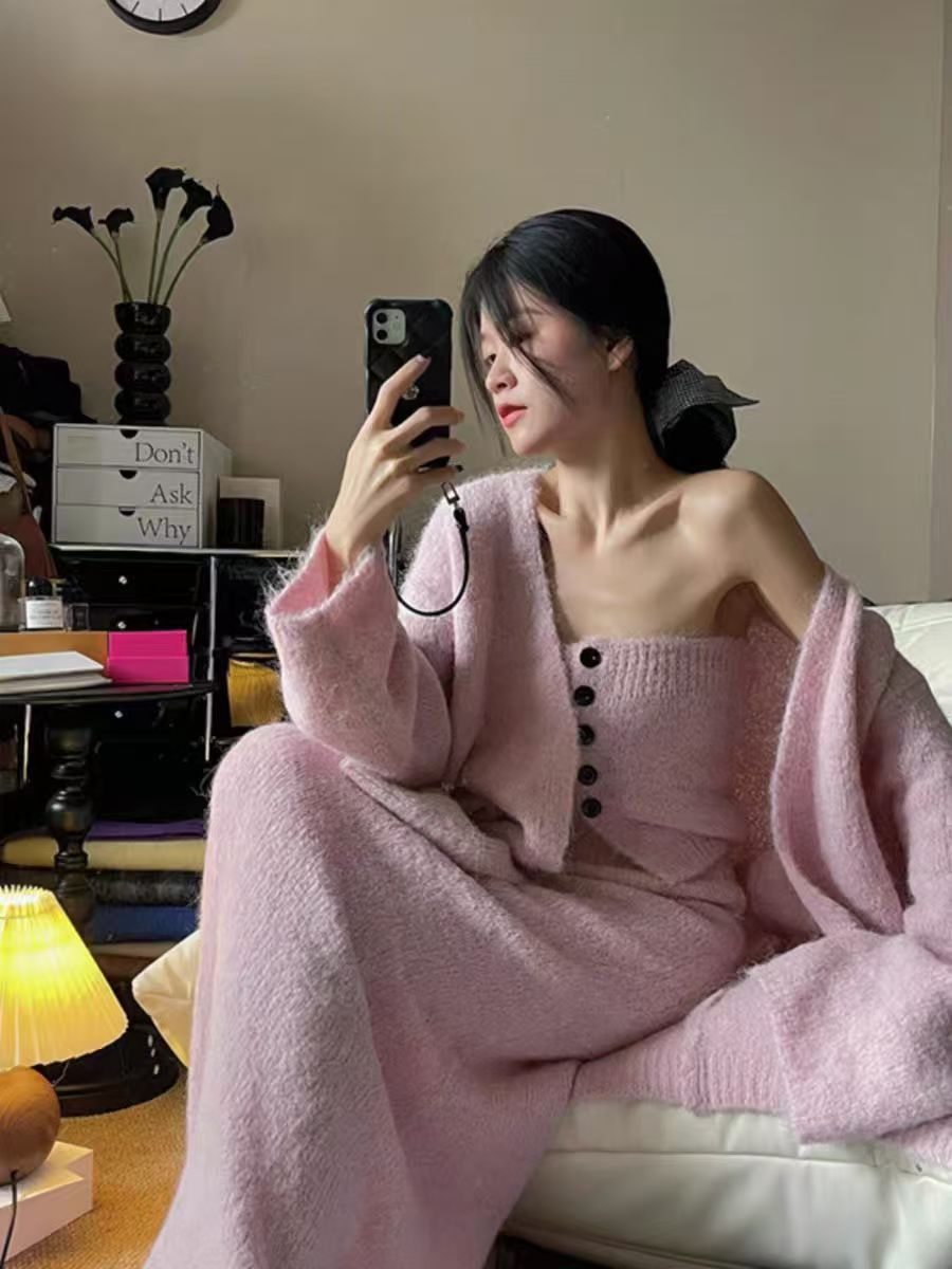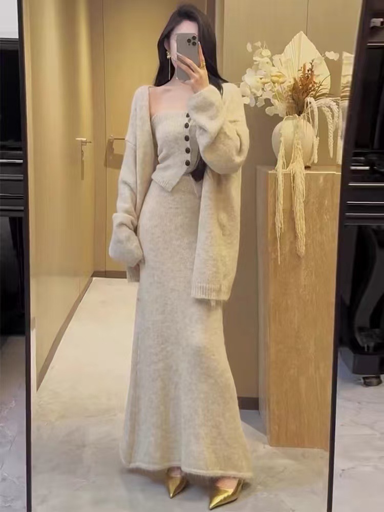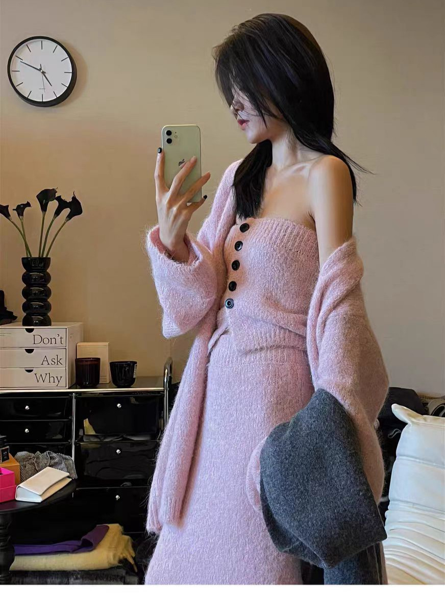 跨境秋冬针织开衫外套女新款慵懒宽松高级感毛衣抹胸半身裙三件套