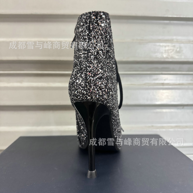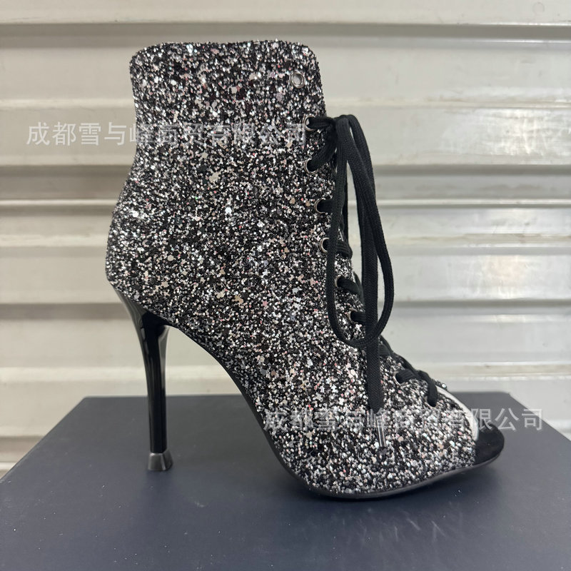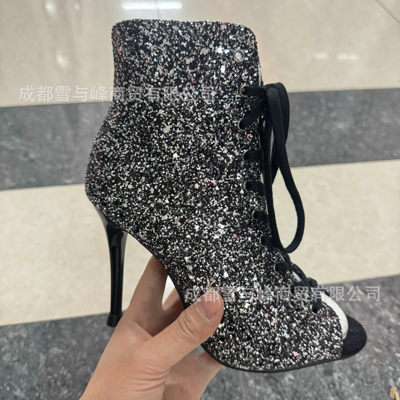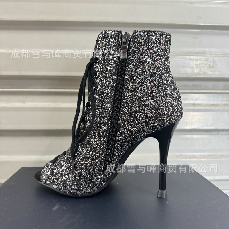 Главная страница > Сандалии с рыбьим ртом, серебристая ткань с блестками на каблуке со сверхвысоким каблуком, полые короткие сапоги джазовый танец танцуют на высоком каблуке