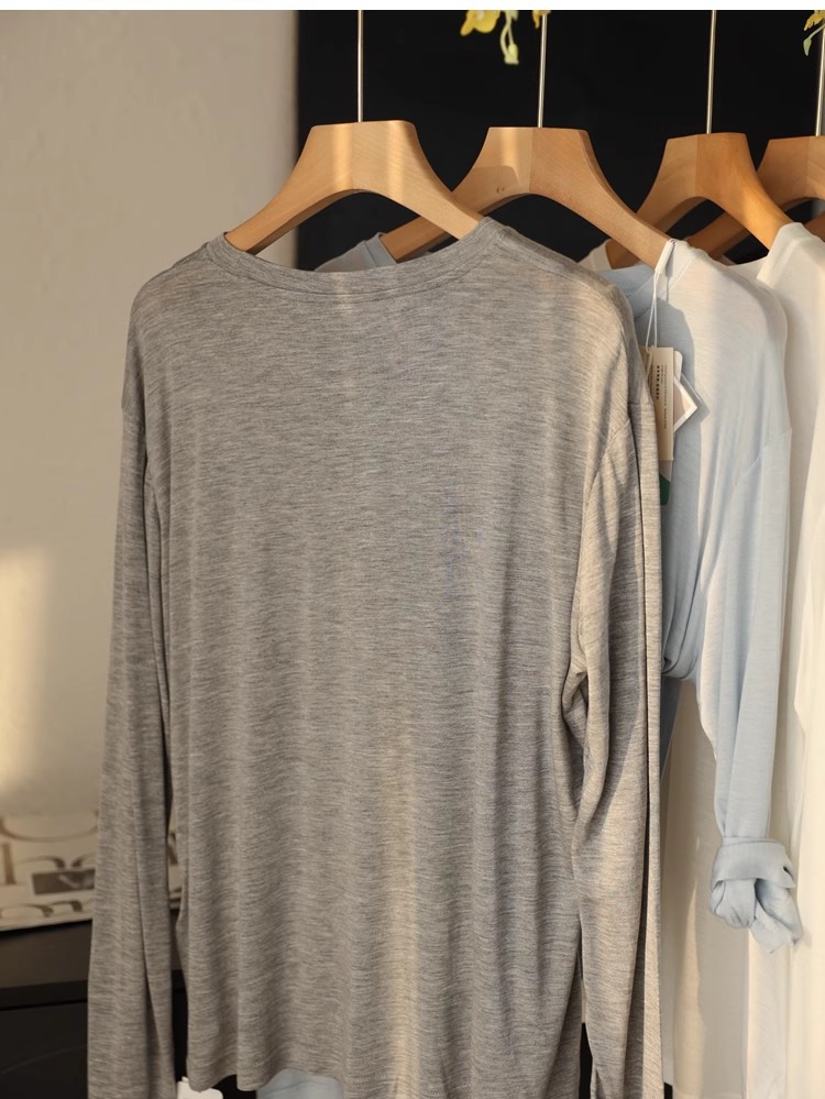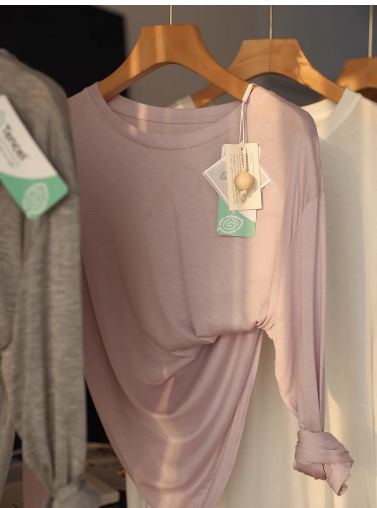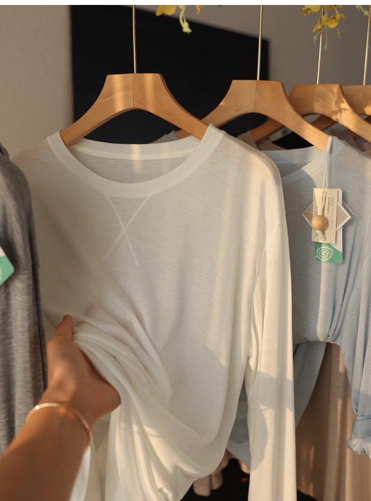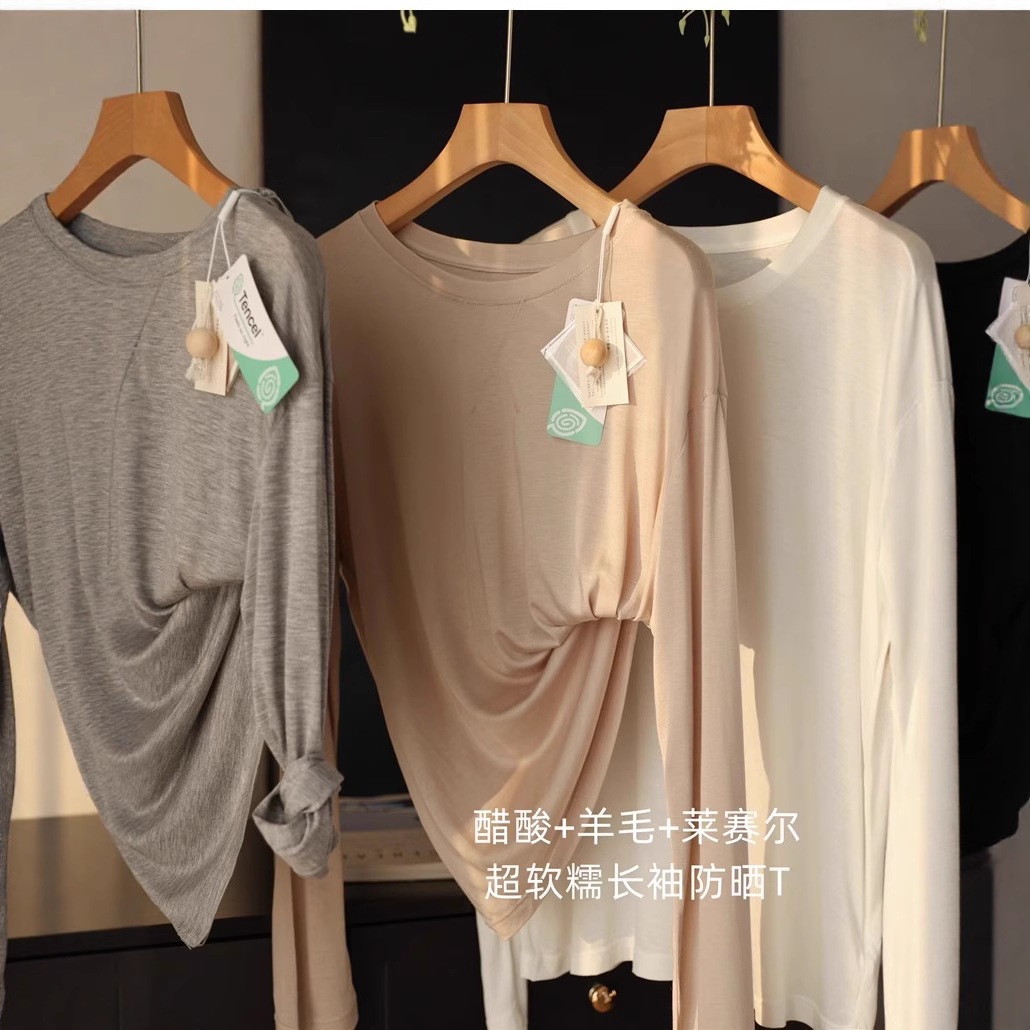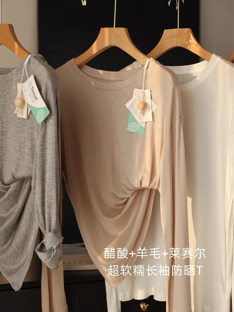 Главная страница > Отличная цена, ацетатная шерсть, лиоцелл, мягкая восковая эластичная футболка с круглым вырезом, тонкая свободная солнцезащитная блузка с длинными рукавами для женщин Xia Xin