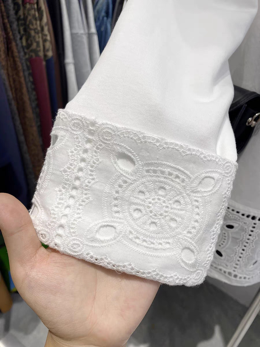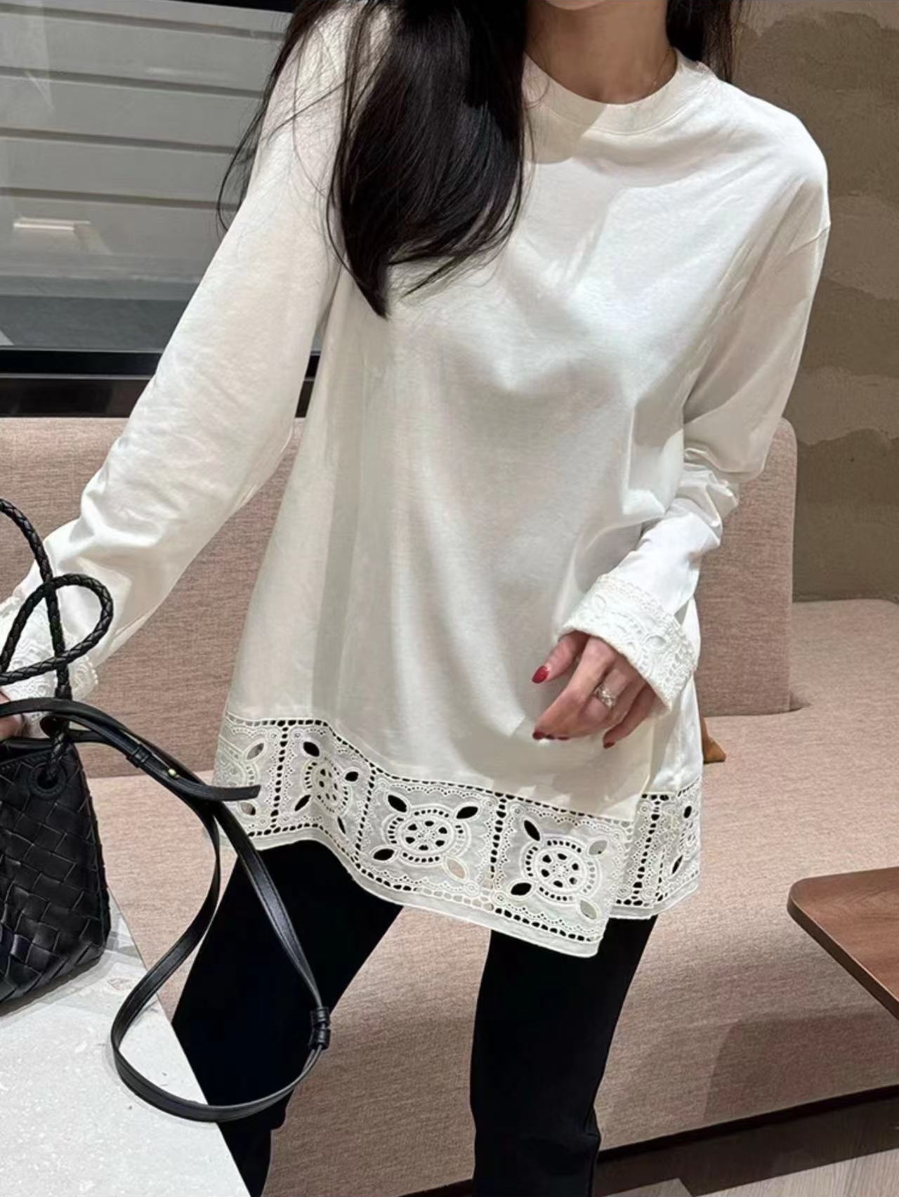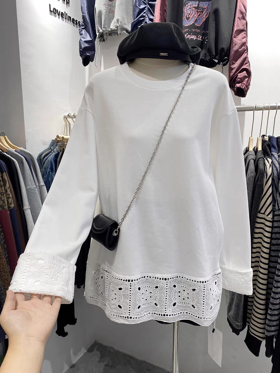 Главная страница > Модная женская футболка в европейском стиле на раннюю осень 2025 года: элегантная, однотонная, с кружевной отделкой, свободного кроя, с длинным рукавом.