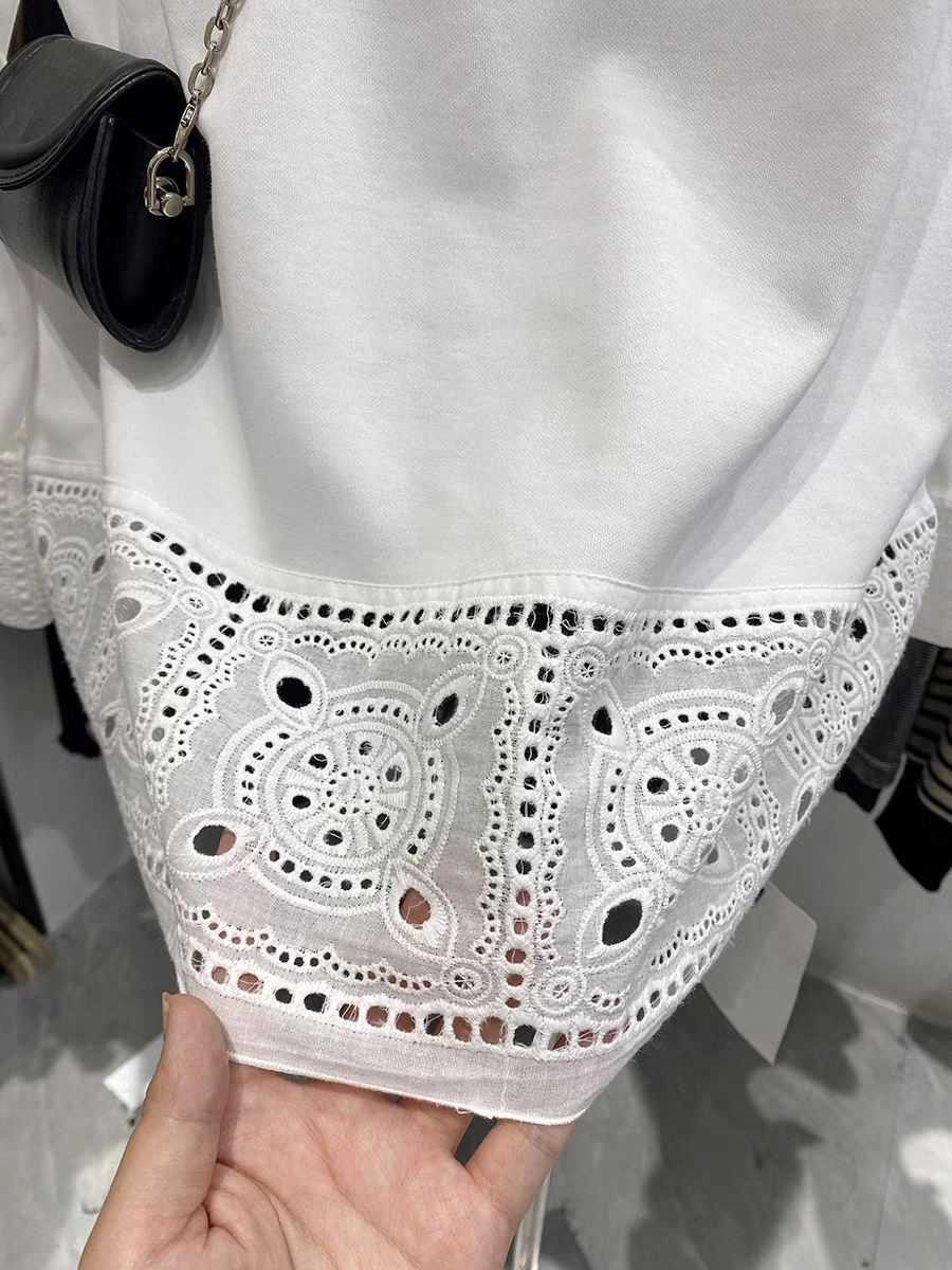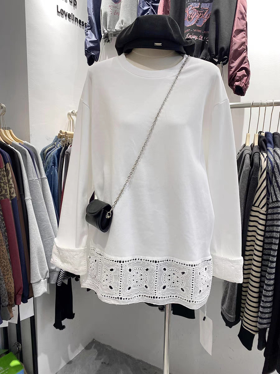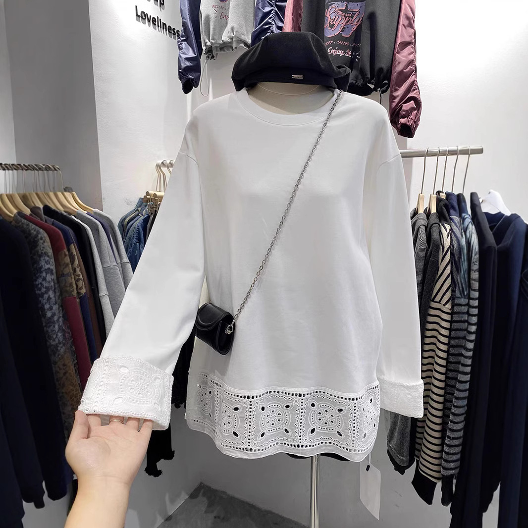 Главная страница > Модная женская футболка в европейском стиле на раннюю осень 2025 года: элегантная, однотонная, с кружевной отделкой, свободного кроя, с длинным рукавом.