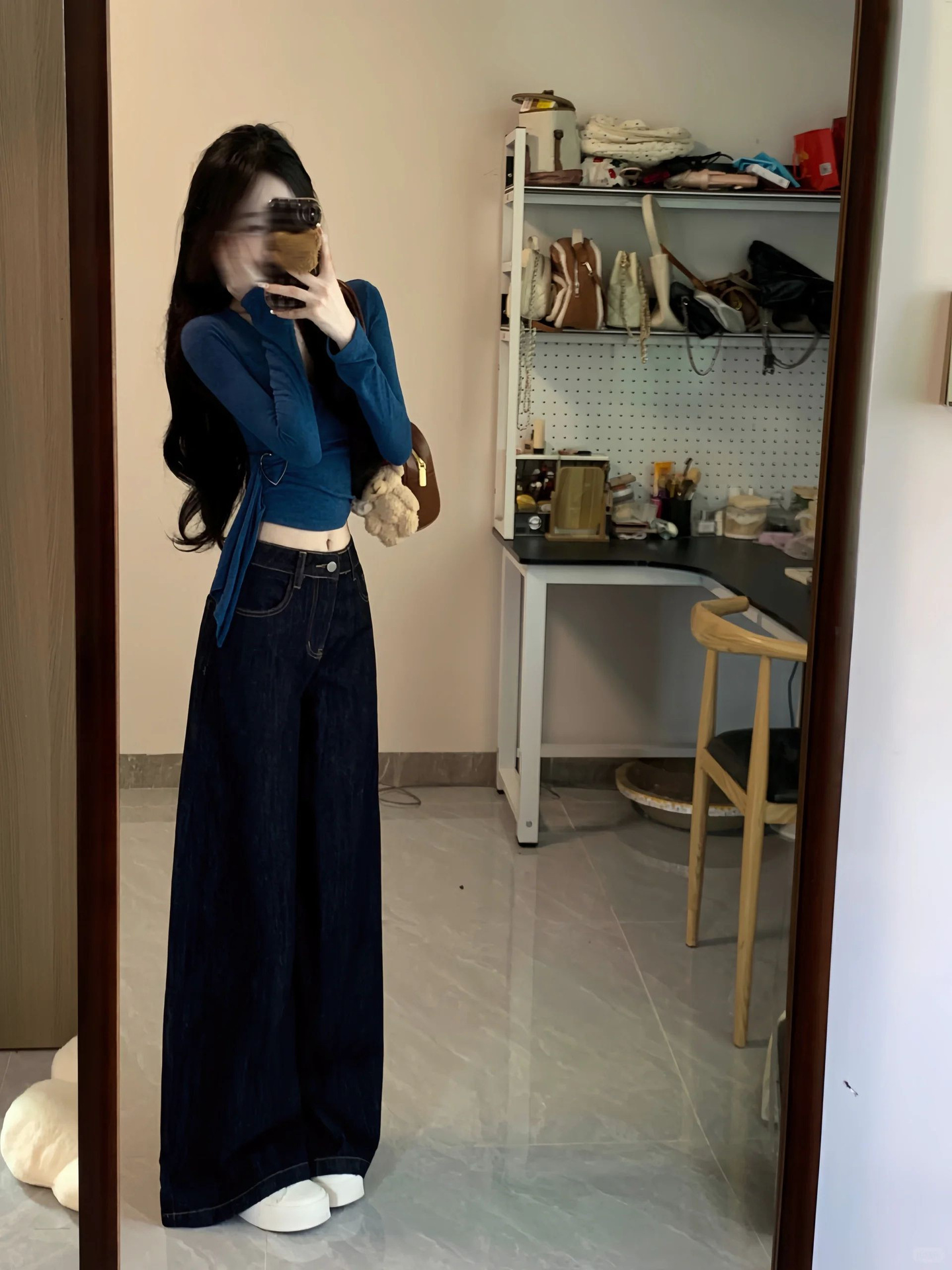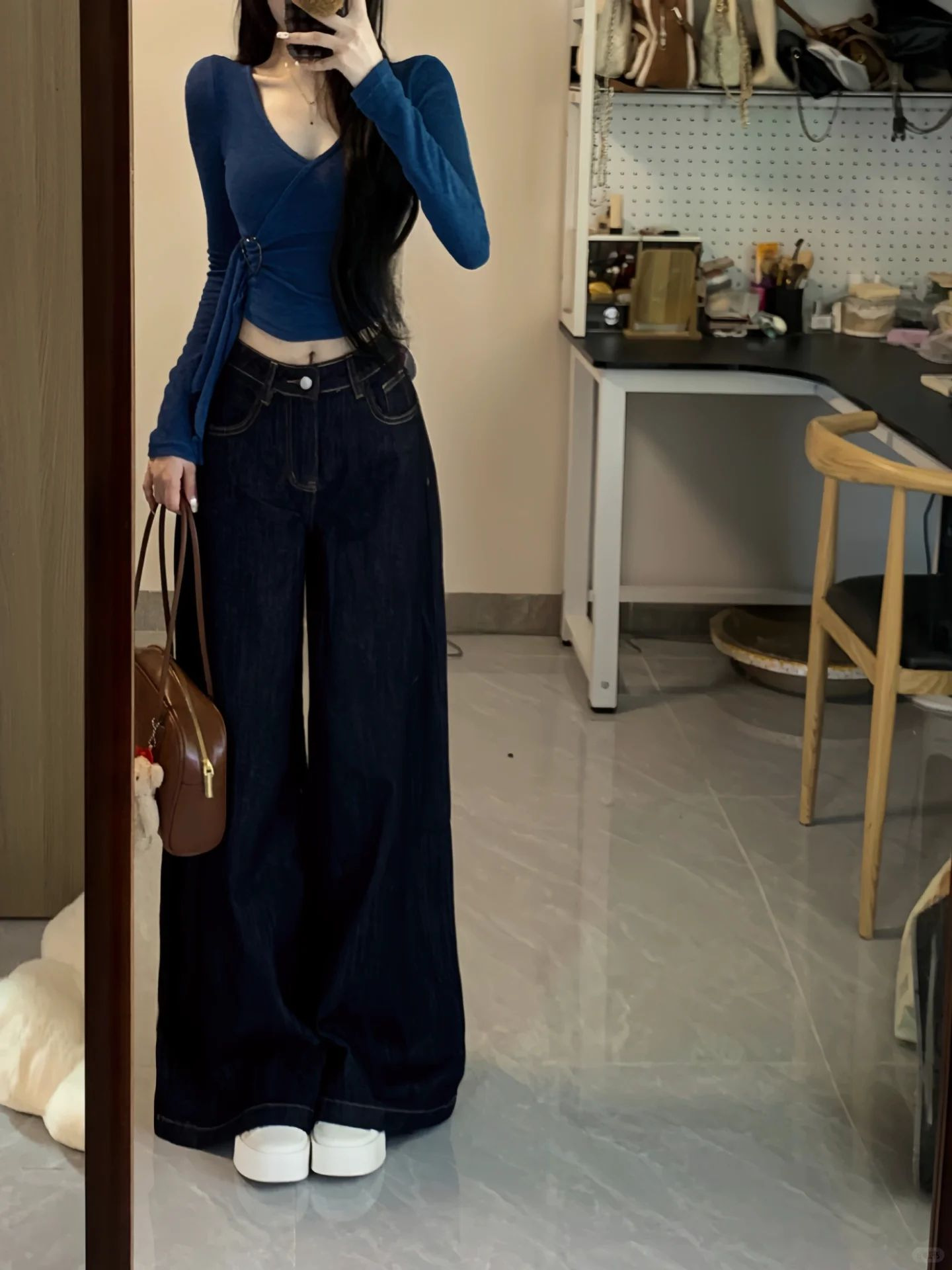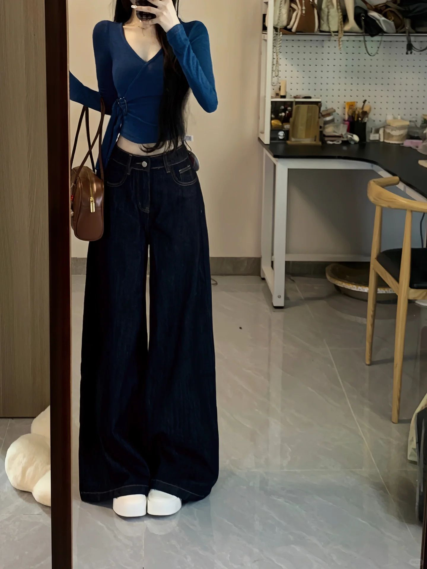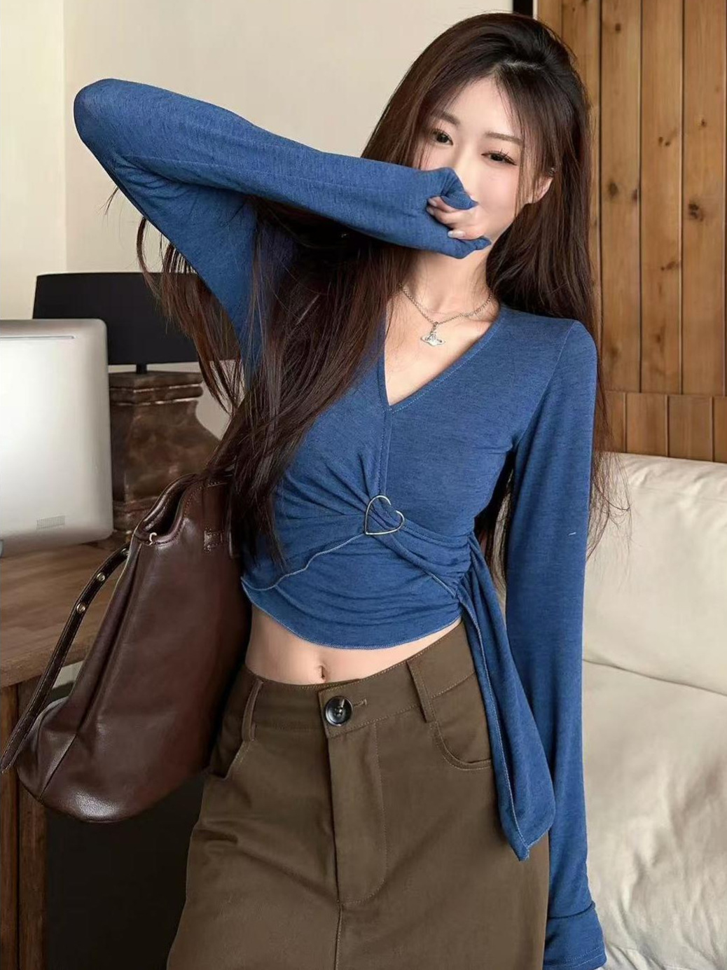 Корейская горячая девушка тонкая футболка с длинным рукавом на плече