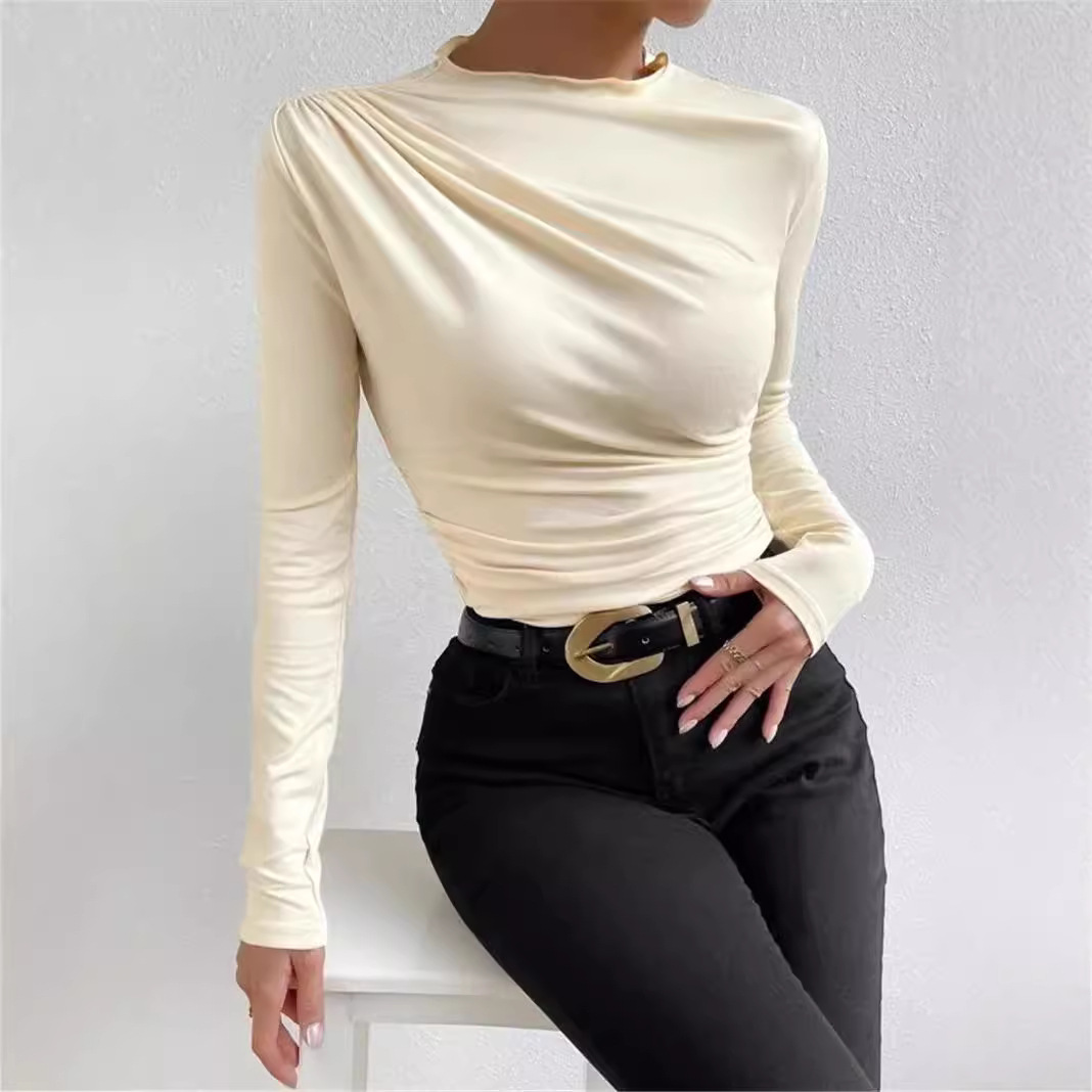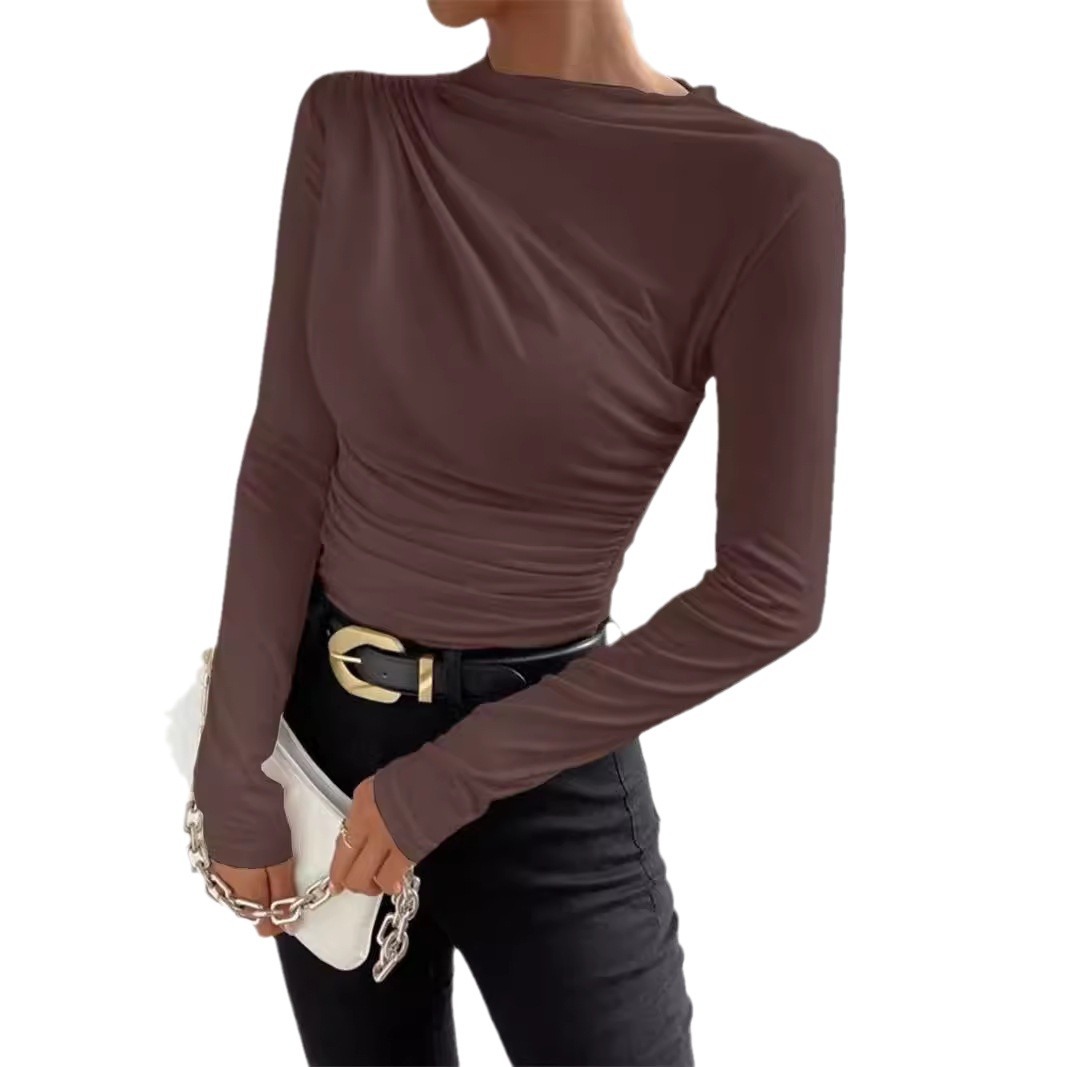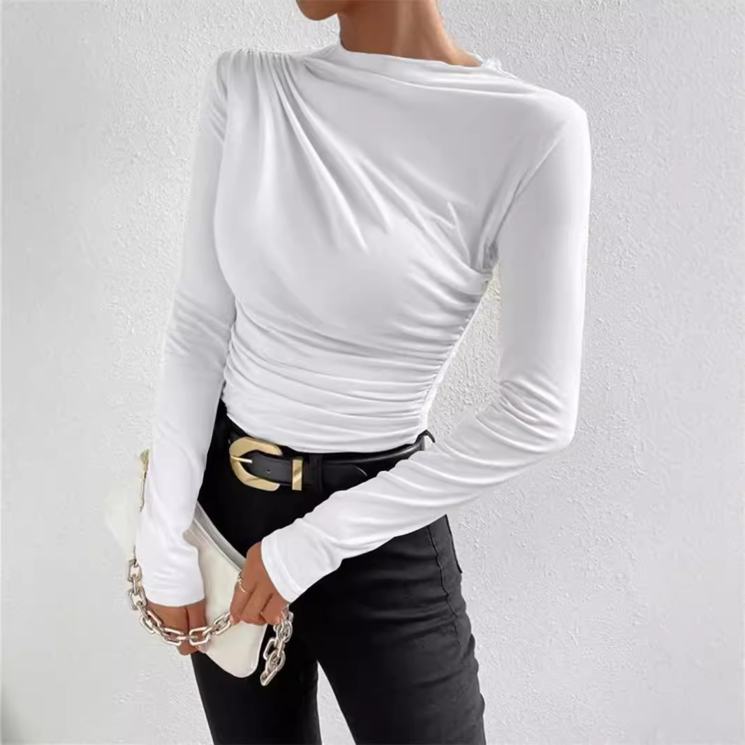Главная страница > Трансграничный 2024 Европейский и Американский сплошной цвет тонкополосная рубашка с трансграничными плиссировками дизайн с длинными рукавами футболка женский топ