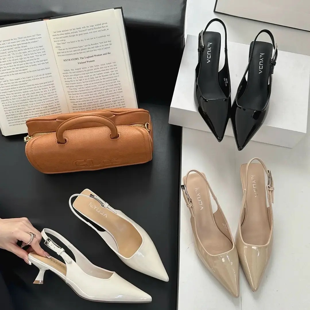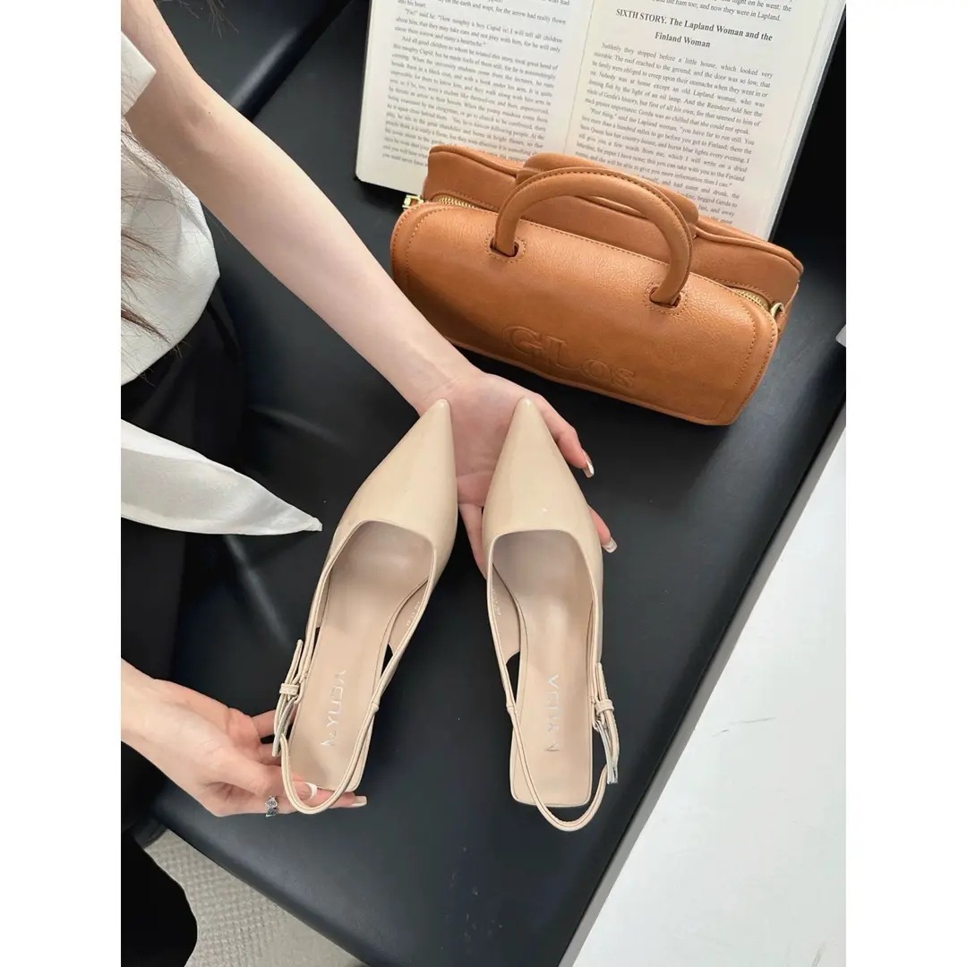 Duyao* [Little Gold Bar] 3cm телесные летние босоножки на высоком каблуке из лакированной кожи с острым носком и открытой спиной для женщин 511
