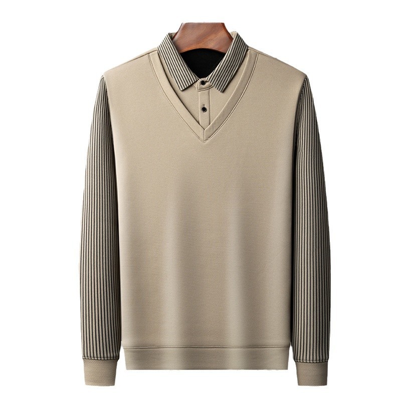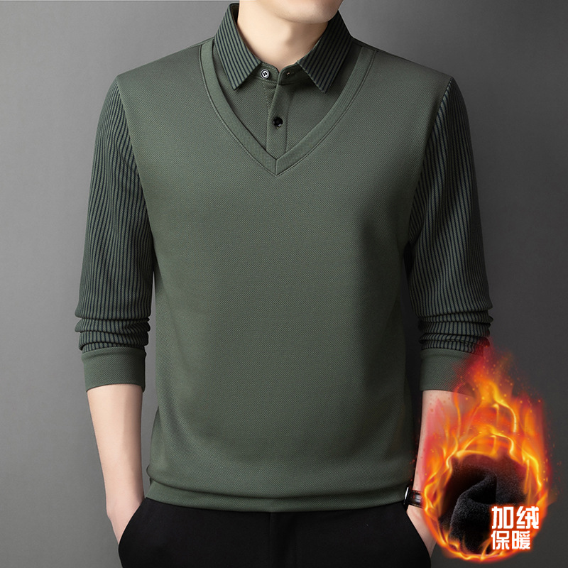Главная страница > Осенние и зимние бархатные мужские поддельные две теплые одежды среднего возраста мужские повседневные лацканы толстые полоски футболки топ