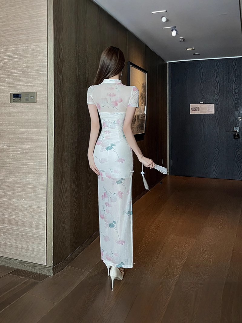 Главная страница > Улучшенное платье Cheongsam в китайском стиле, женская летняя новая сетчатая юбка, утягивающая юбка средней длины с разрезом, закрывающая бедра