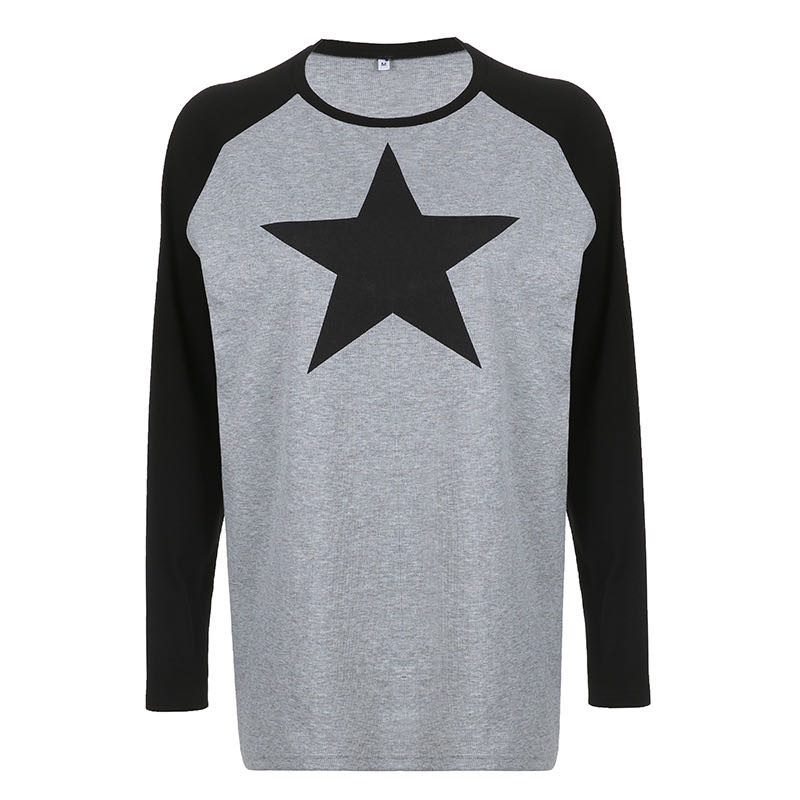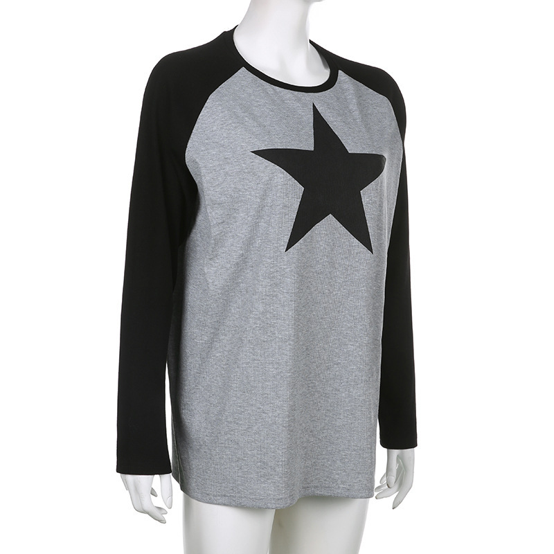 Главная страница > Европейская и американская свободная футболка реглан контрастного цвета, женская весенне-осенняя футболка из полиэстера и хлопка с принтом звезд, женский стиль с длинными рукавами