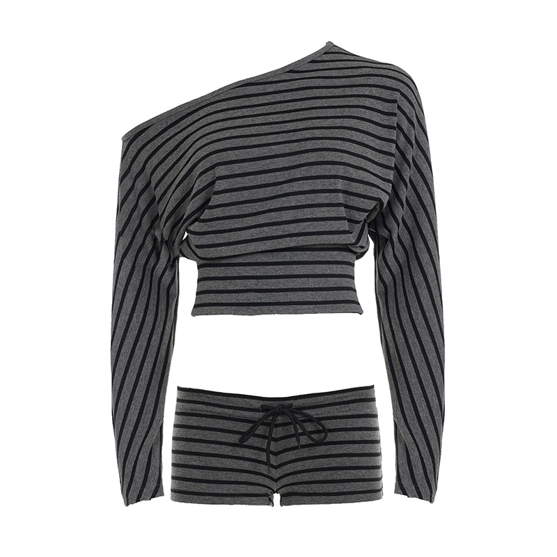 Главная страница > 美式辣妹风条纹斜肩长袖T恤女秋季宽松休闲收腰显瘦短款露肩上衣