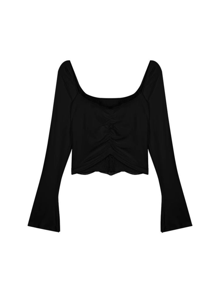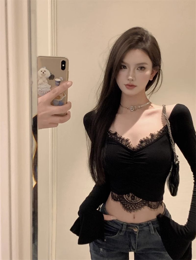Главная страница > Черная женская футболка с v-образным вырезом и кружевными рукавами-колокольчиками, весна-осень 2025, нишевая сексуальная тонкая короткая рубашка Pure Desire