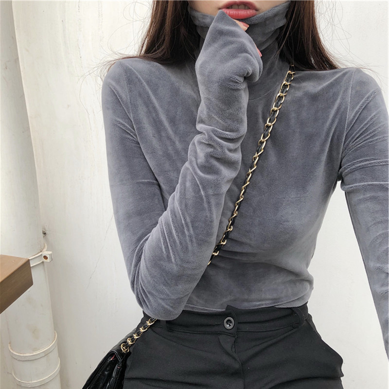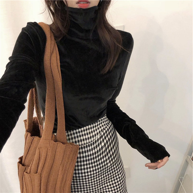 Трансграничная женская футболка сплошного цвета с золотым бархатом с высоким воротником и нижней рубашкой