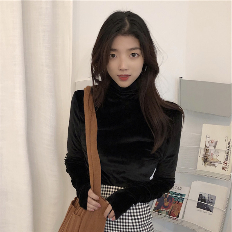 Главная страница > Трансграничная женская футболка сплошного цвета с золотым бархатом с высоким воротником и нижней рубашкой