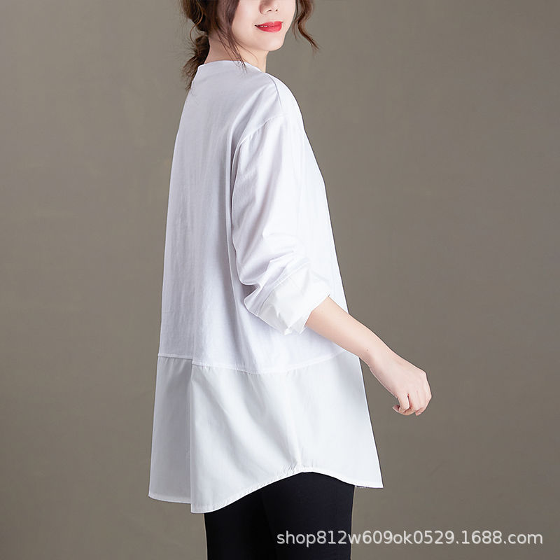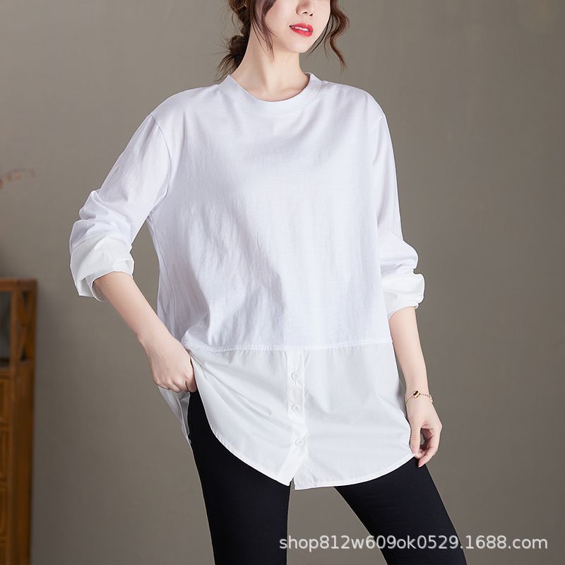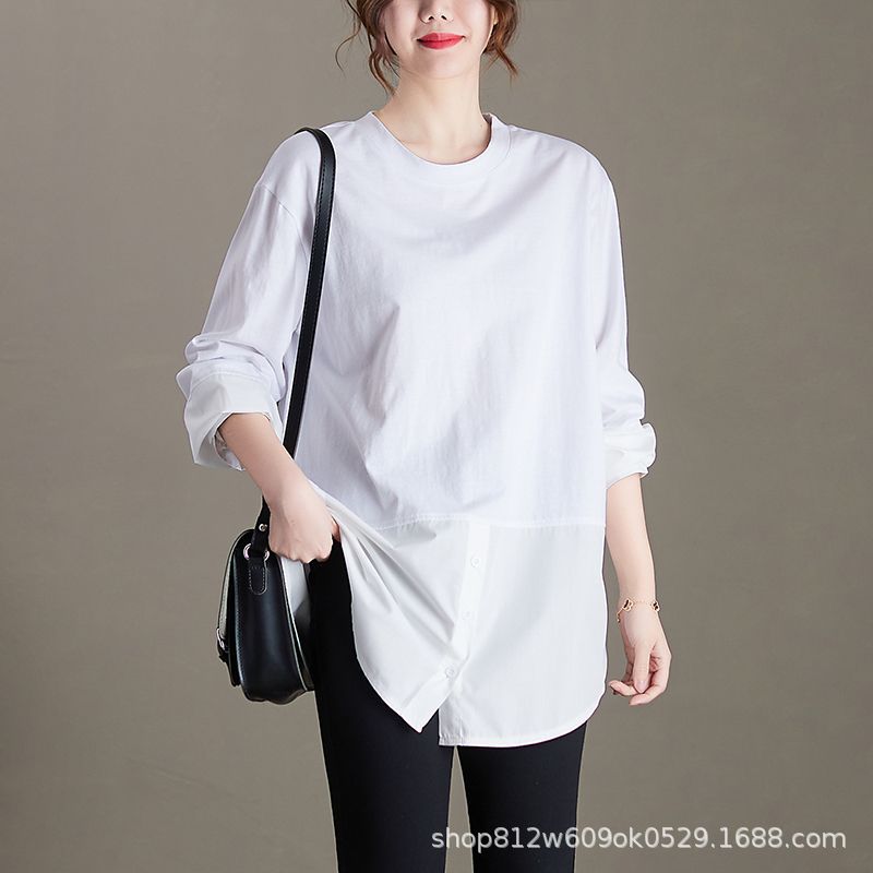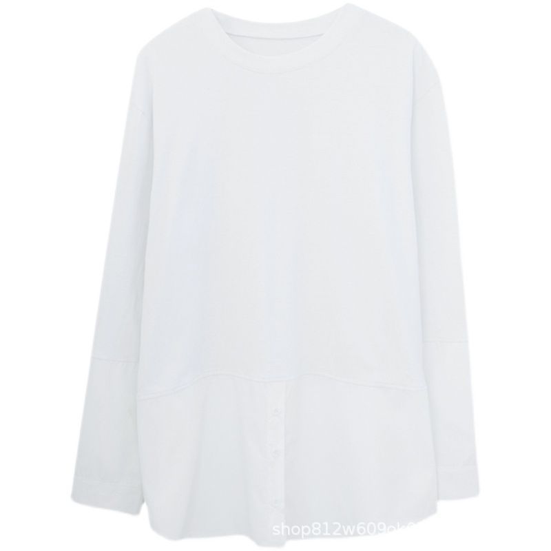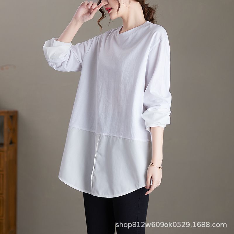 Главная страница > Белая женская футболка с рукавами в стиле пэчворк, осенне-зимняя свободная базовая рубашка средней длины со стильным дизайном и длинными рукавами.
