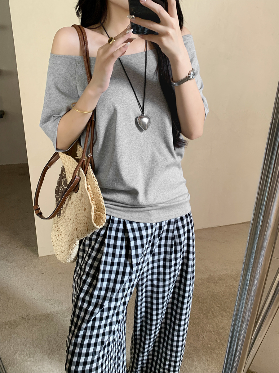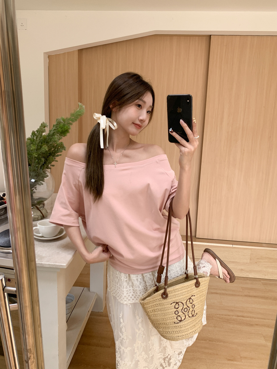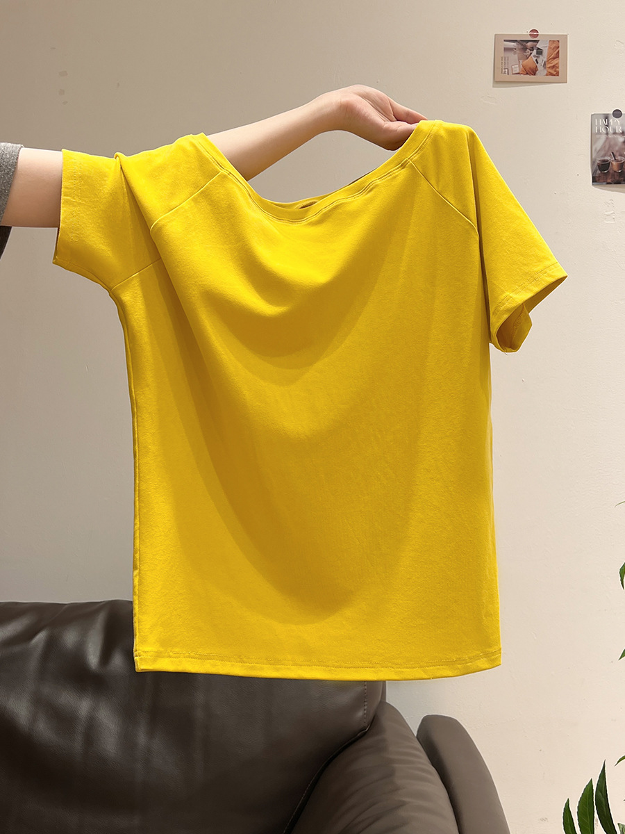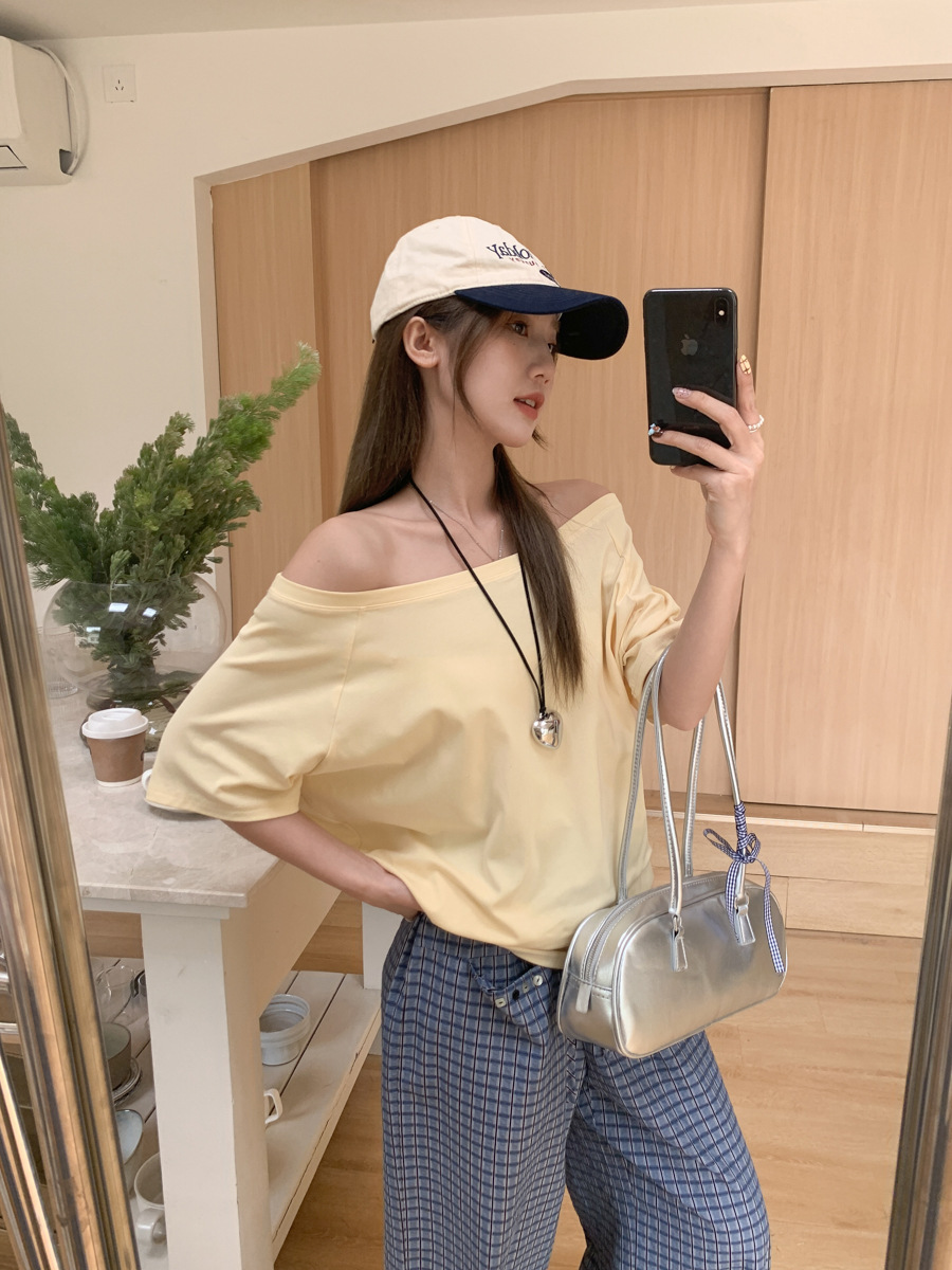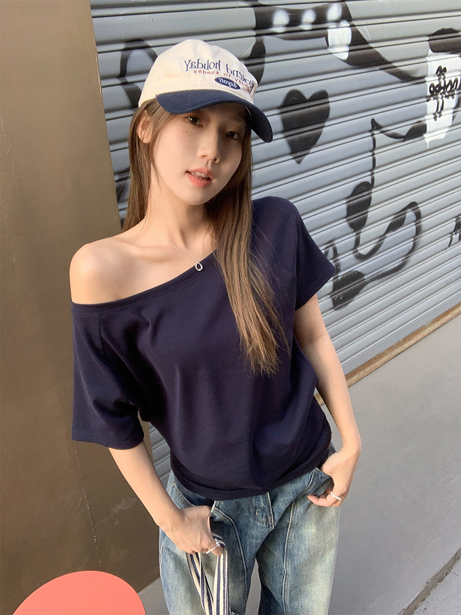 Главная страница > Женская футболка с открытыми плечами, с короткими рукавами, новый стиль лета 2025 года, свободный, утягивающий и обтягивающий топ на одно плечо для горячих девушек.