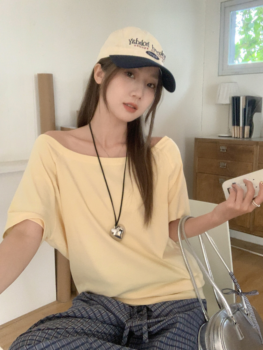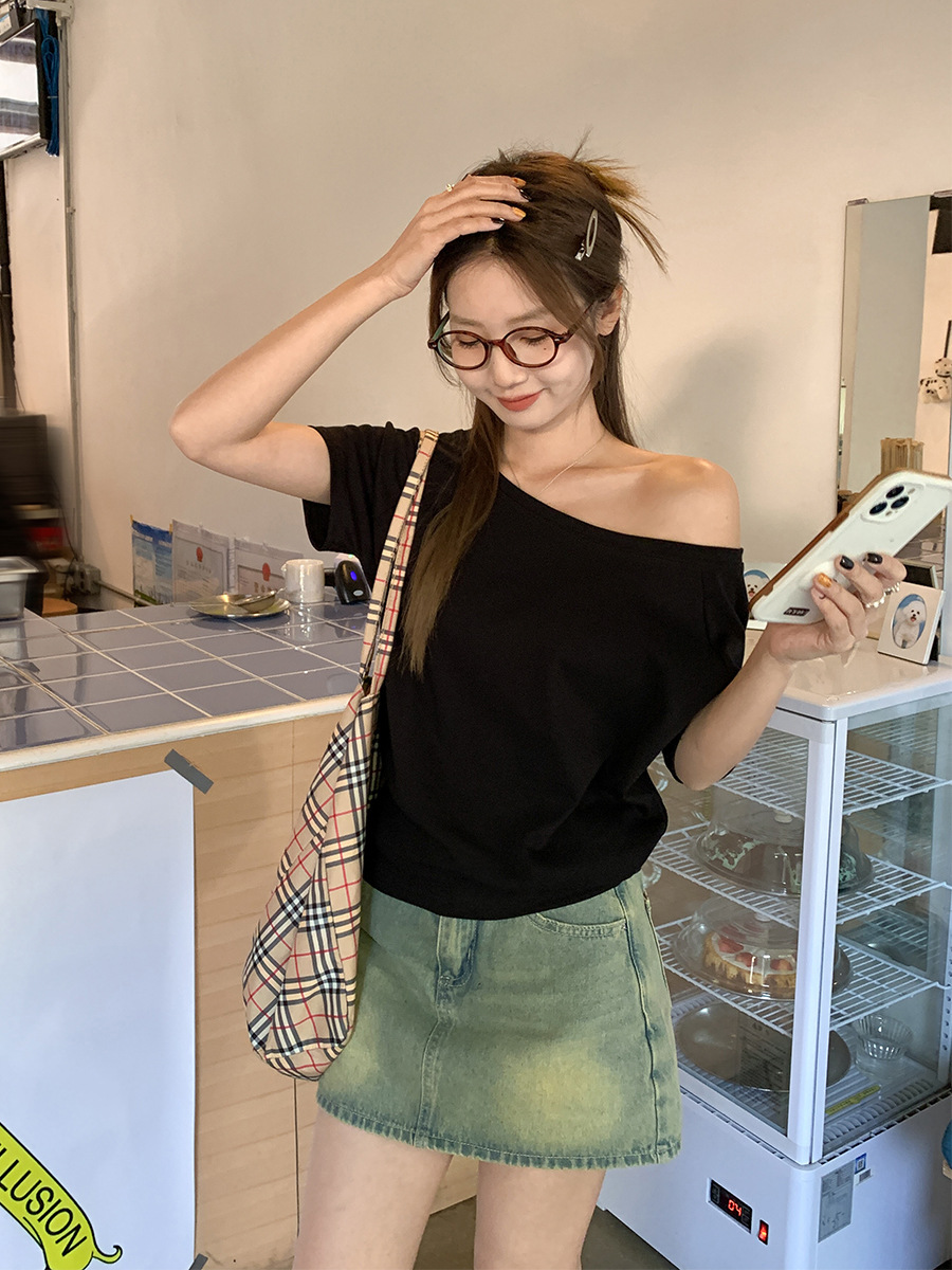 Женская футболка с открытыми плечами, с короткими рукавами, новый стиль лета 2025 года, свободный, утягивающий и обтягивающий топ на одно плечо для горячих девушек.