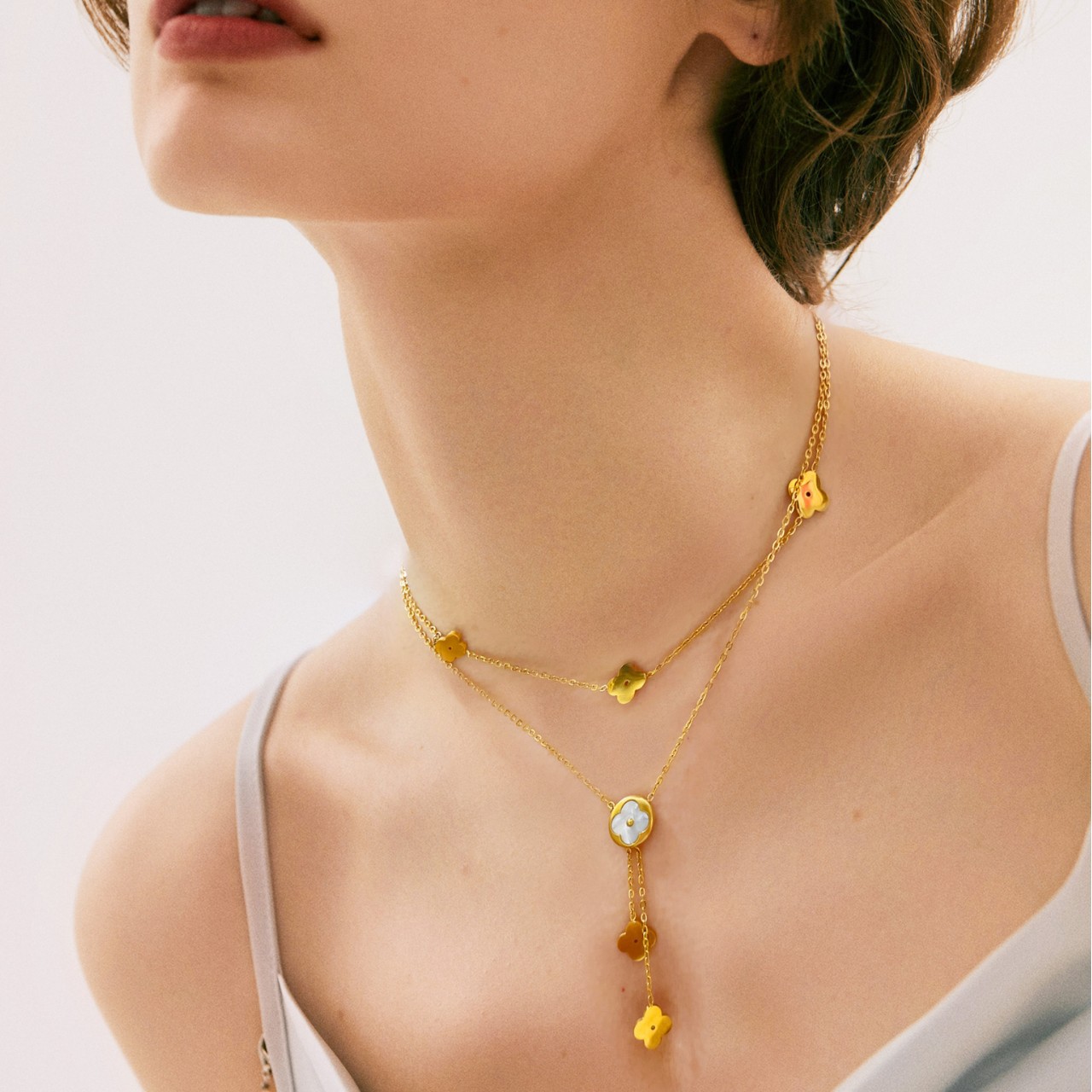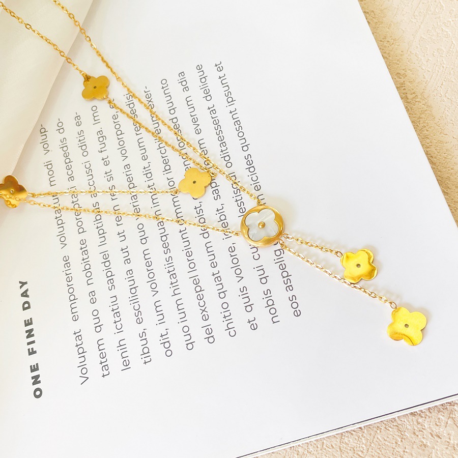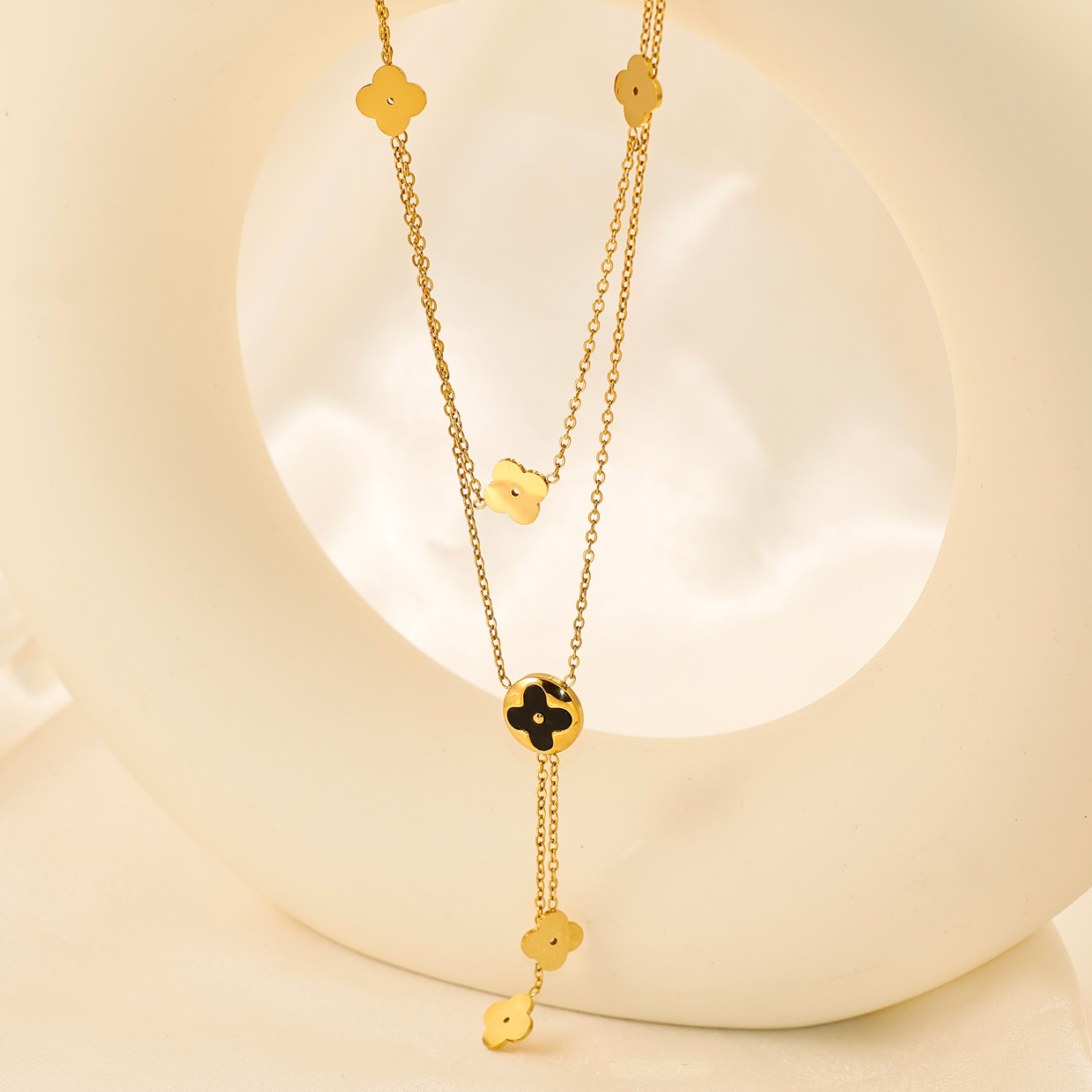 Главная страница > Новое двухслойное ожерелье в форме цветка с глянцевыми бусинами, простая цепочка на ключицы с эффектом высокого класса, элегантное покрытие из титановой стали с 18-каратным золотом.