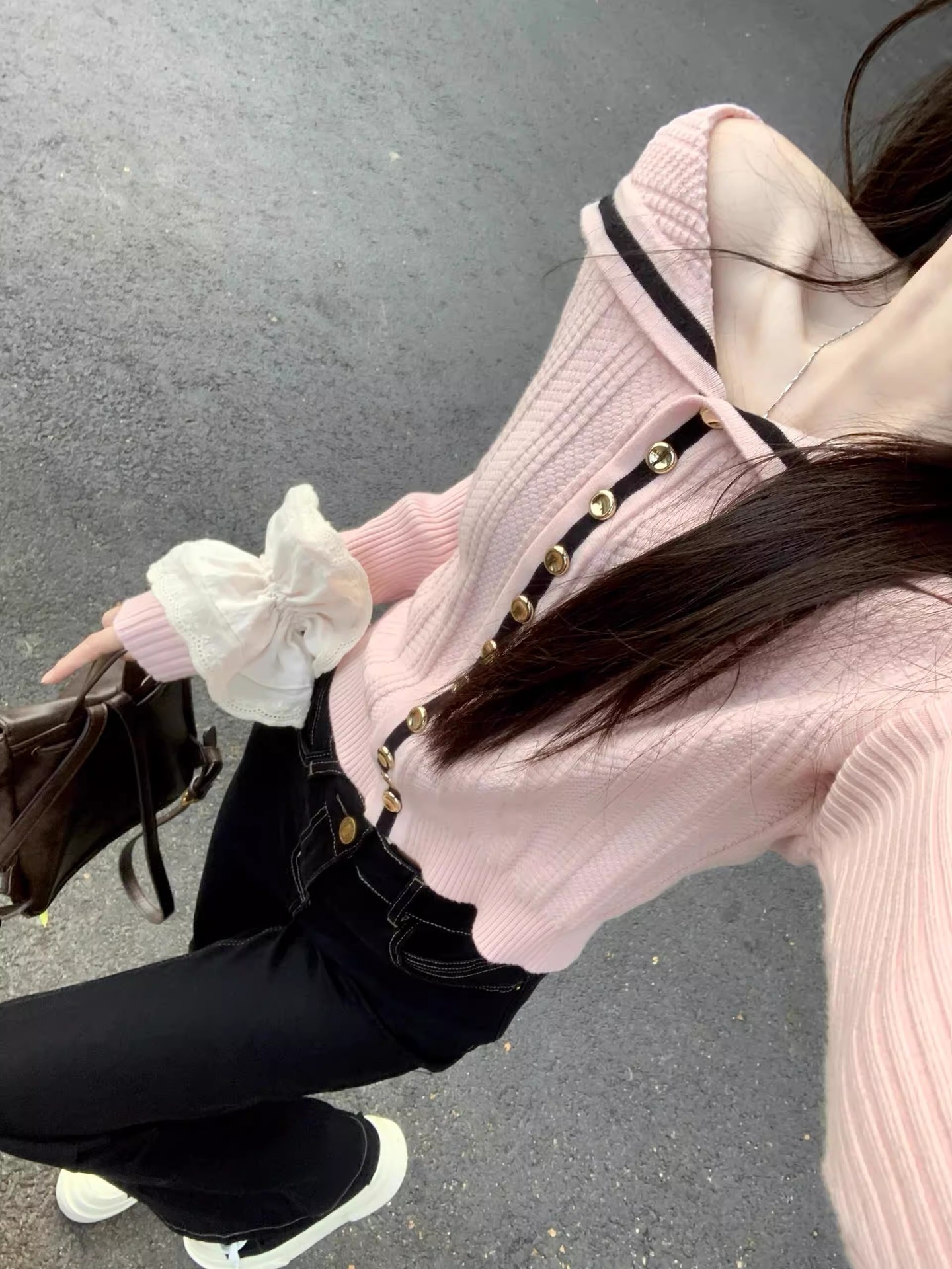 Военно-морской воротник розовый свитер на плечах кардиган женский осенний и зимний новый сладкий минус трикотажный короткий топ пальто