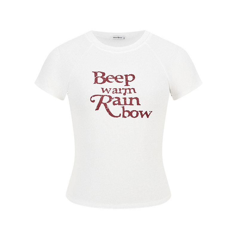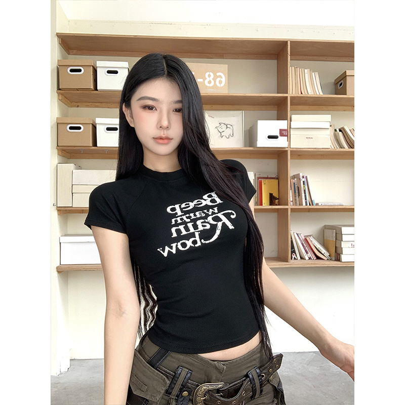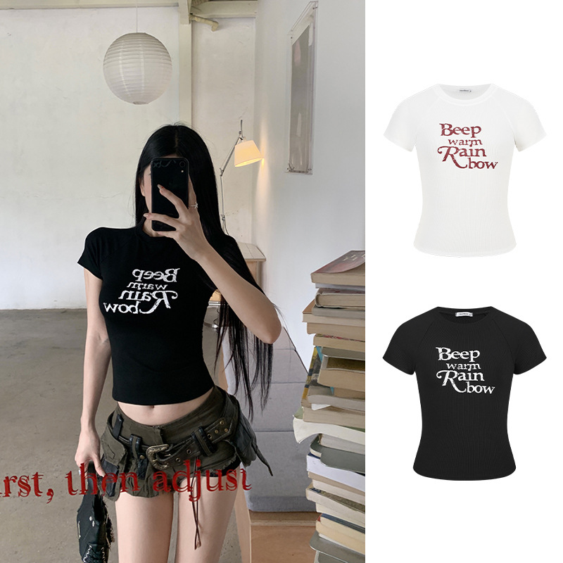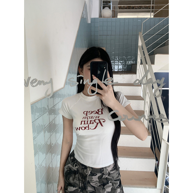 Главная страница > Реальный снимок на складе — женская летняя футболка с короткими рукавами, круглым вырезом, обычными плечами, облегающим кроем, буквенным принтом, укороченным топом.