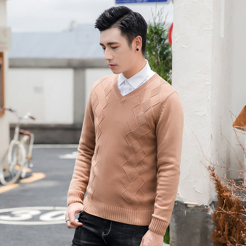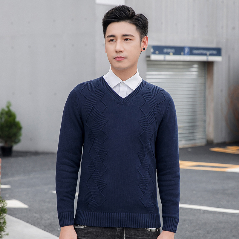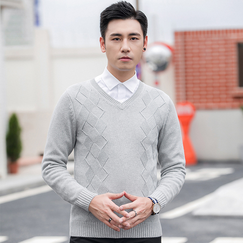 Главная страница > Новый осенне-зимний свитер, мужской однотонный жаккардовый свитер с V-образным вырезом в Корейском стиле, приталенный шерстяной свитер, мужская мода