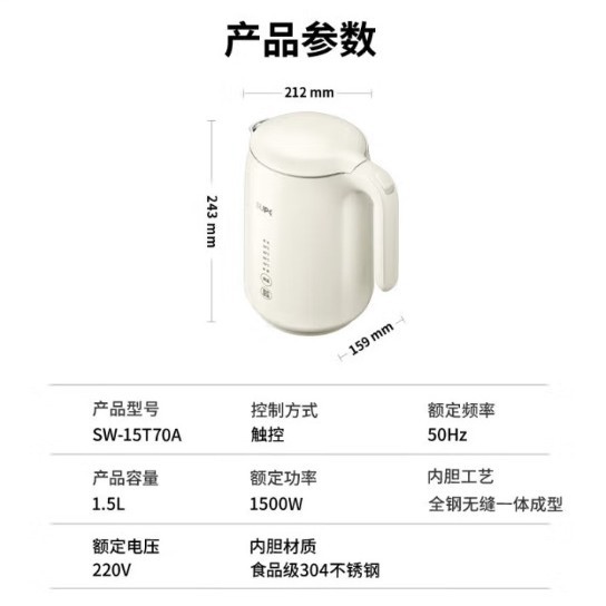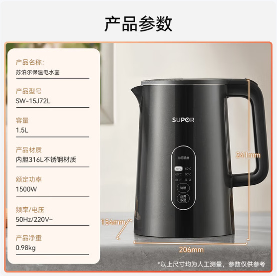 SUPOR/Supor электрический чайник 1,5 л бытовой из нержавеющей стали 316 с теплоизоляцией встроенный чайник SW-15J72L