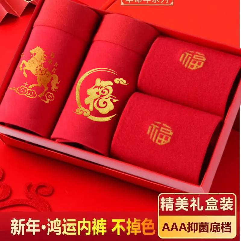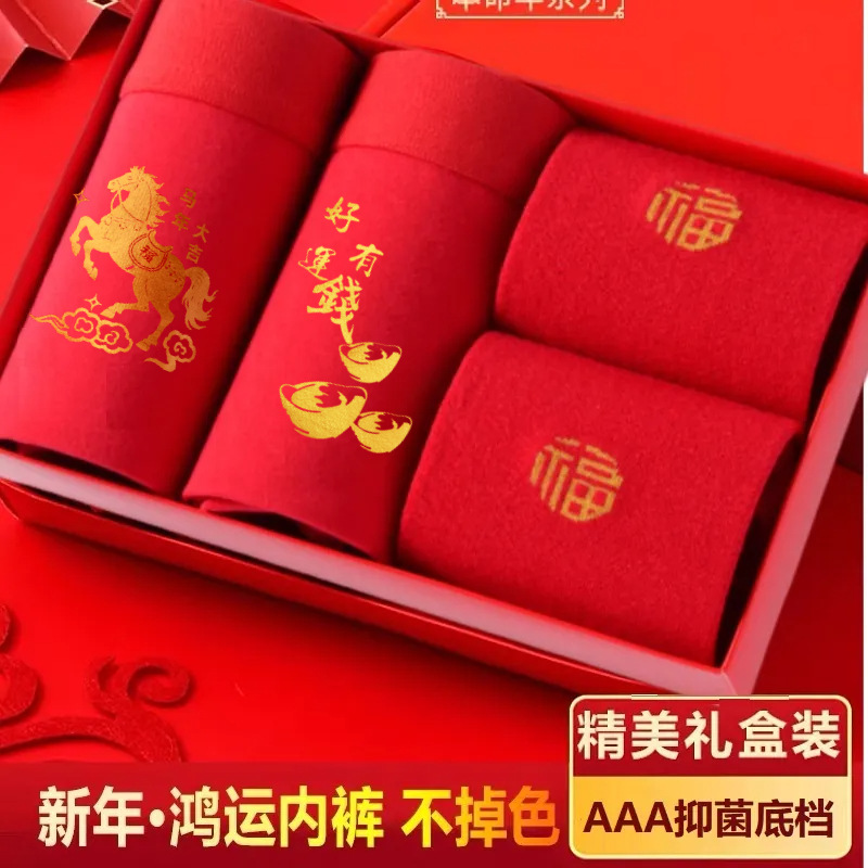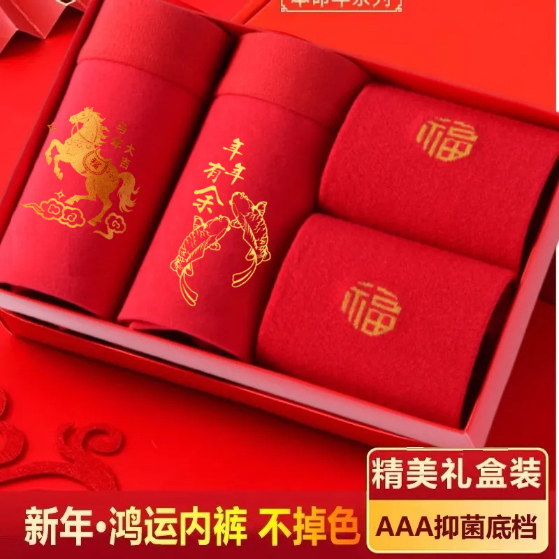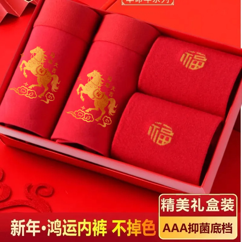 Подарочная коробка из чистого хлопка [Золотая лошадь + Пять благословений + 2 пары красных носков]