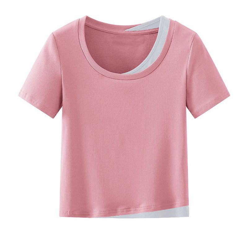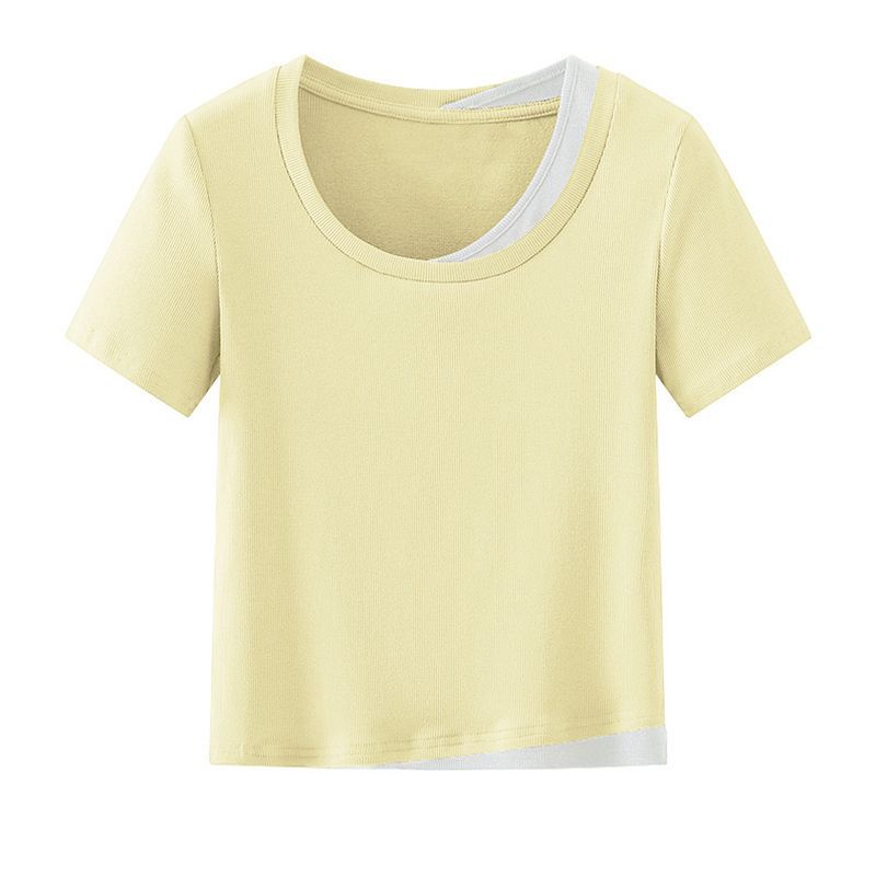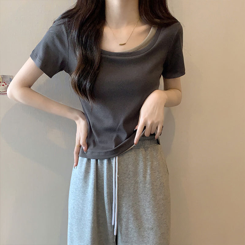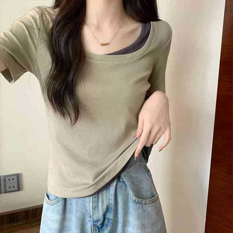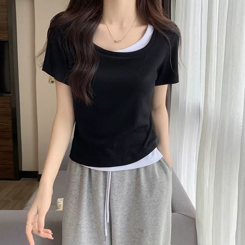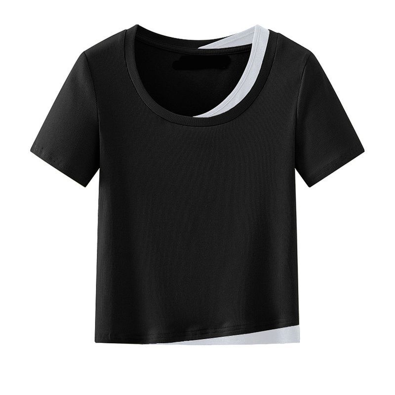 Главная страница > Тонкая ключица с положным плечом дизайн поддельные две футболки с короткими рукавами летом 2025 супер горячий шикарный горячий топ черный