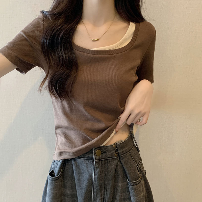 Тонкая ключица с положным плечом дизайн поддельные две футболки с короткими рукавами летом 2025 супер горячий шикарный горячий топ черный