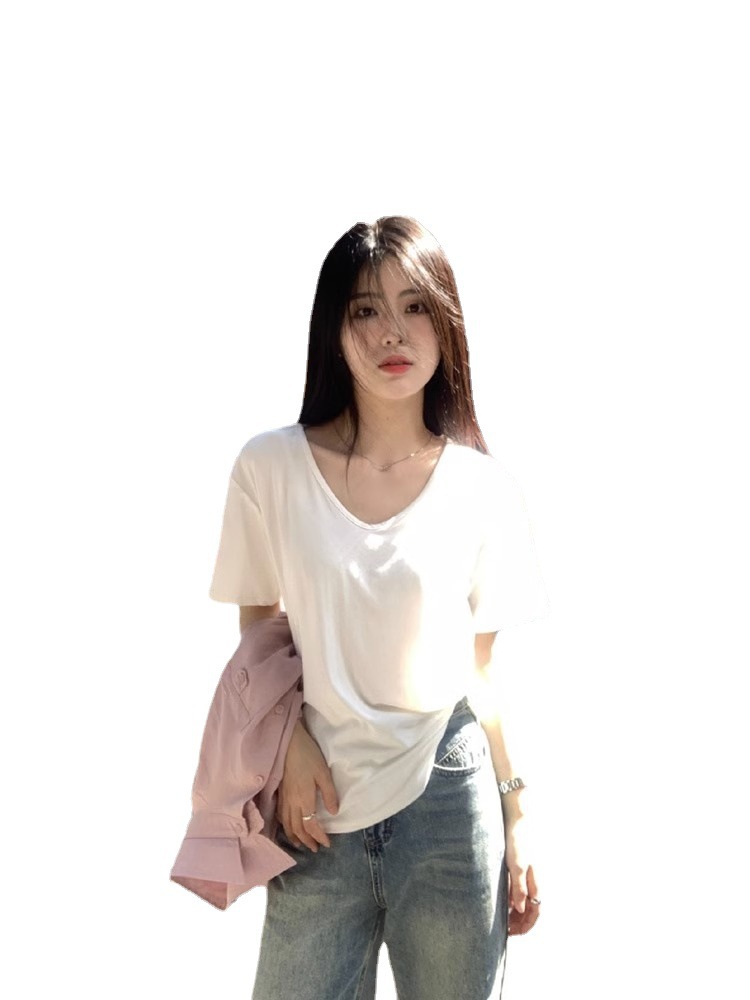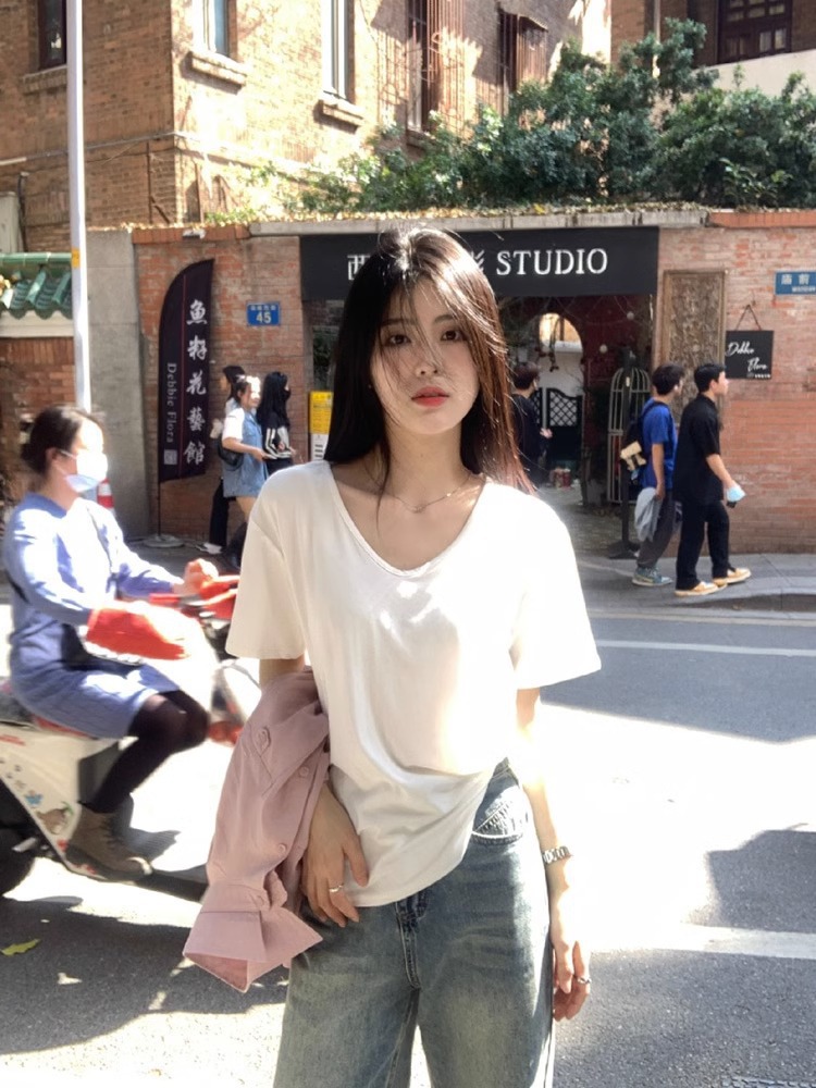 Главная страница > Женская футболка с U-образным вырезом и короткими рукавами, белая, правое плечо, 2024, большой вырез, свободная, утягивающая, внутренняя однотонная футболка, короткий стиль