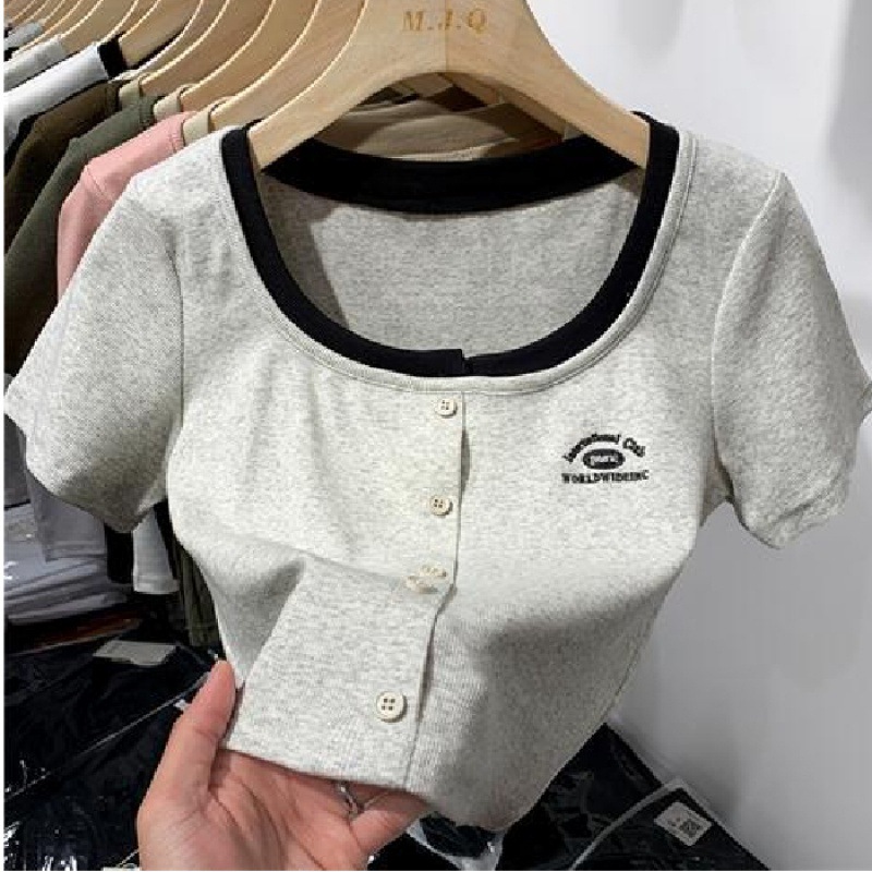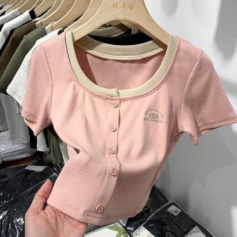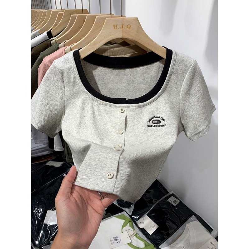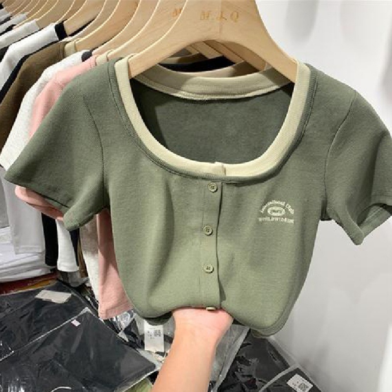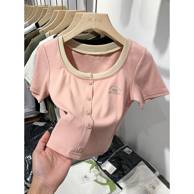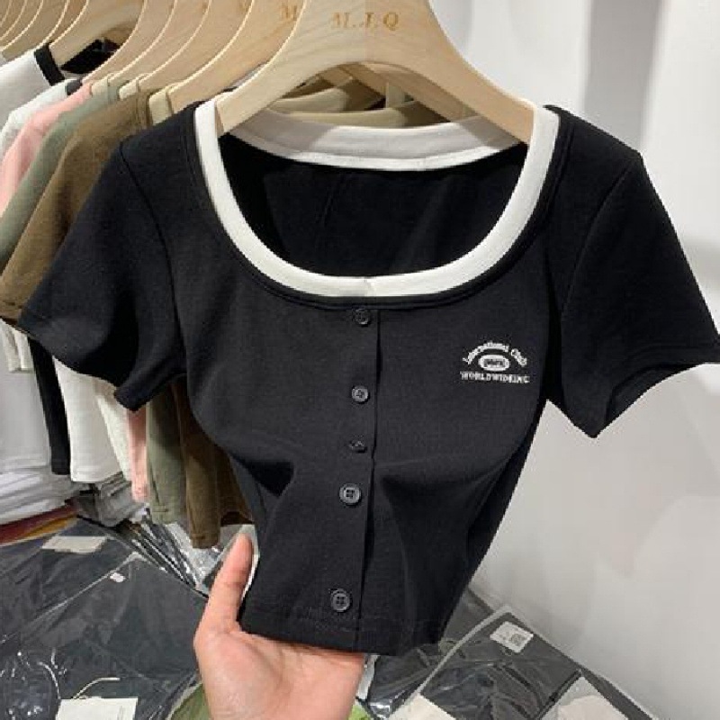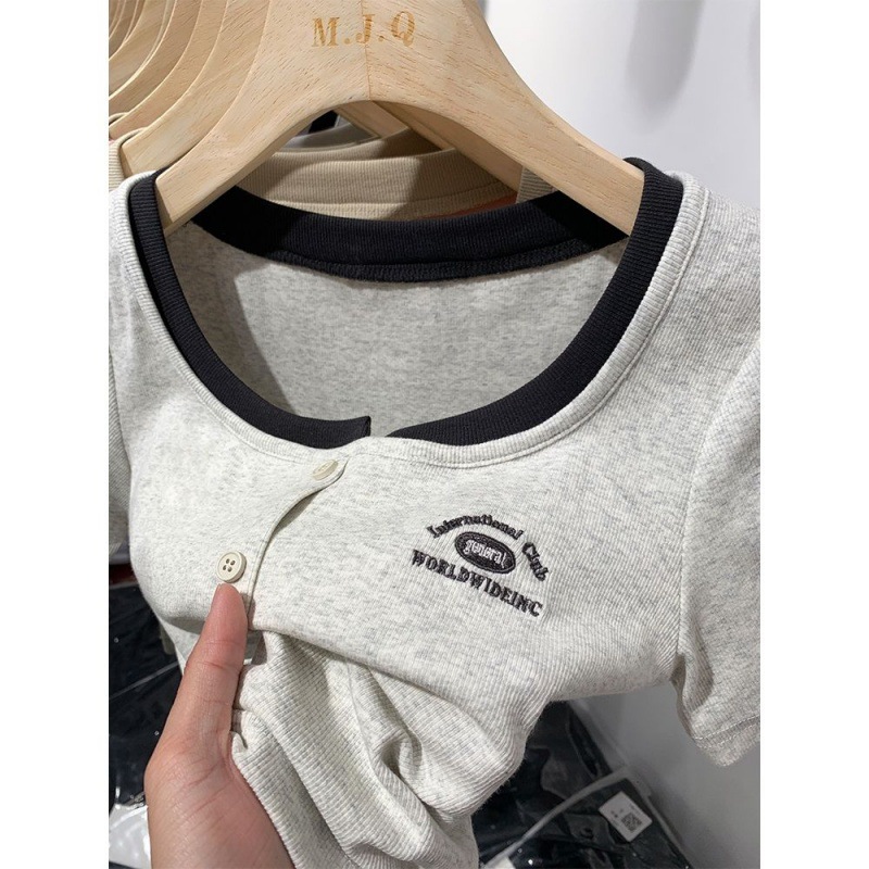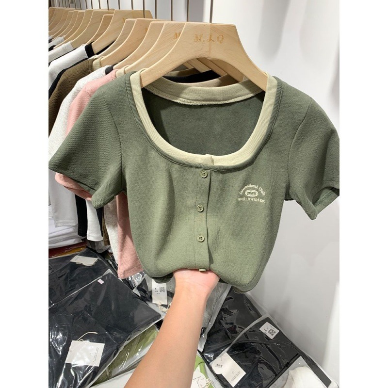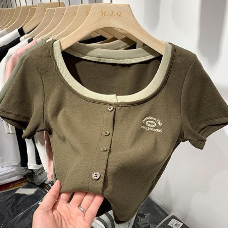 Главная страница > Конверт поддельные две футболки с квадратным вырезом для женщин с короткими рукавами 2024 Летний новый свитер с вышивкой тонкий тонкий короткий топ
