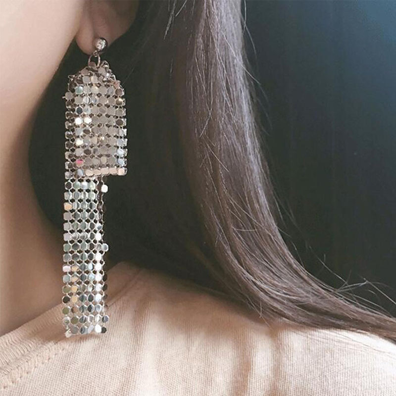 Геометрические металлические блестки длинные серьги с бахромой никой