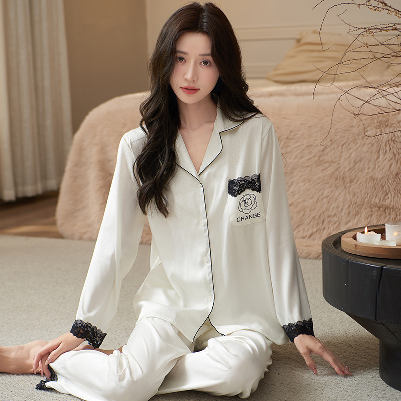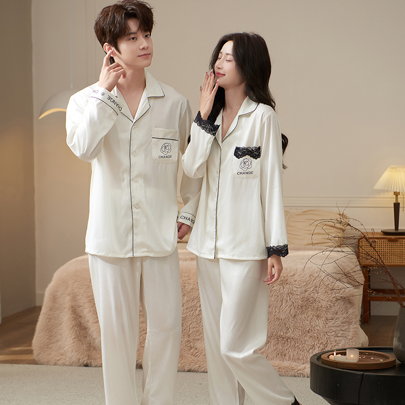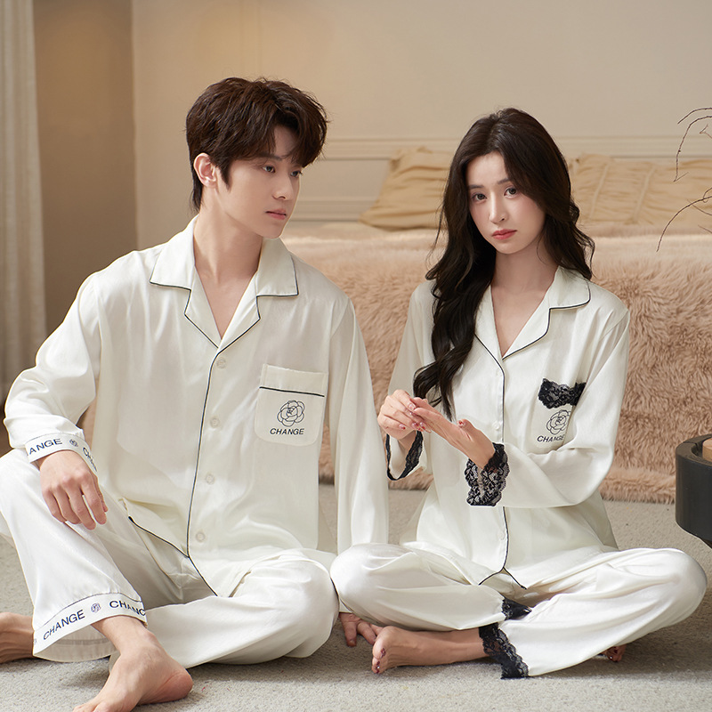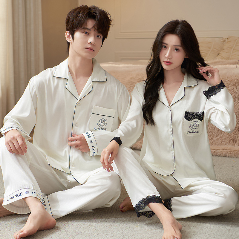 Главная страница > Весенняя и осенняя пижама Ледяной шелк женский с длинными рукавами сексуальный кружевной халат утренний халат мужской костюм костюм