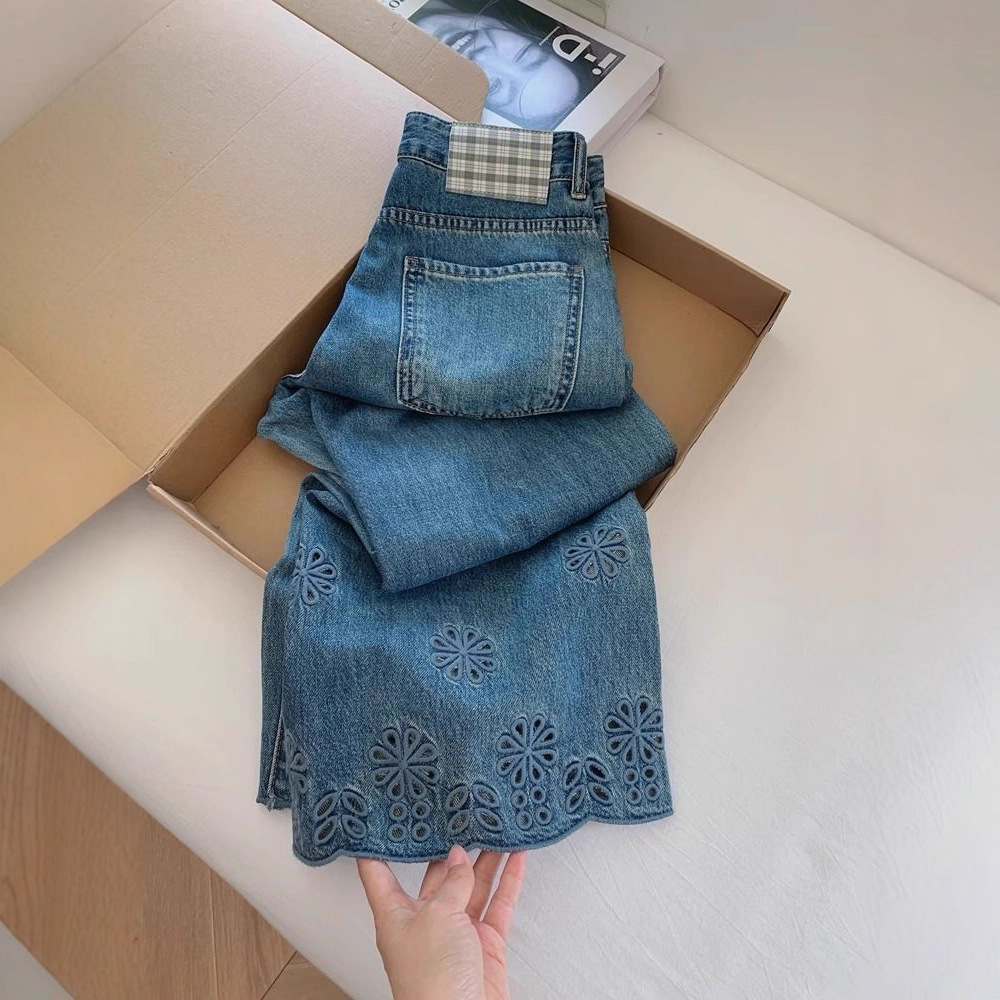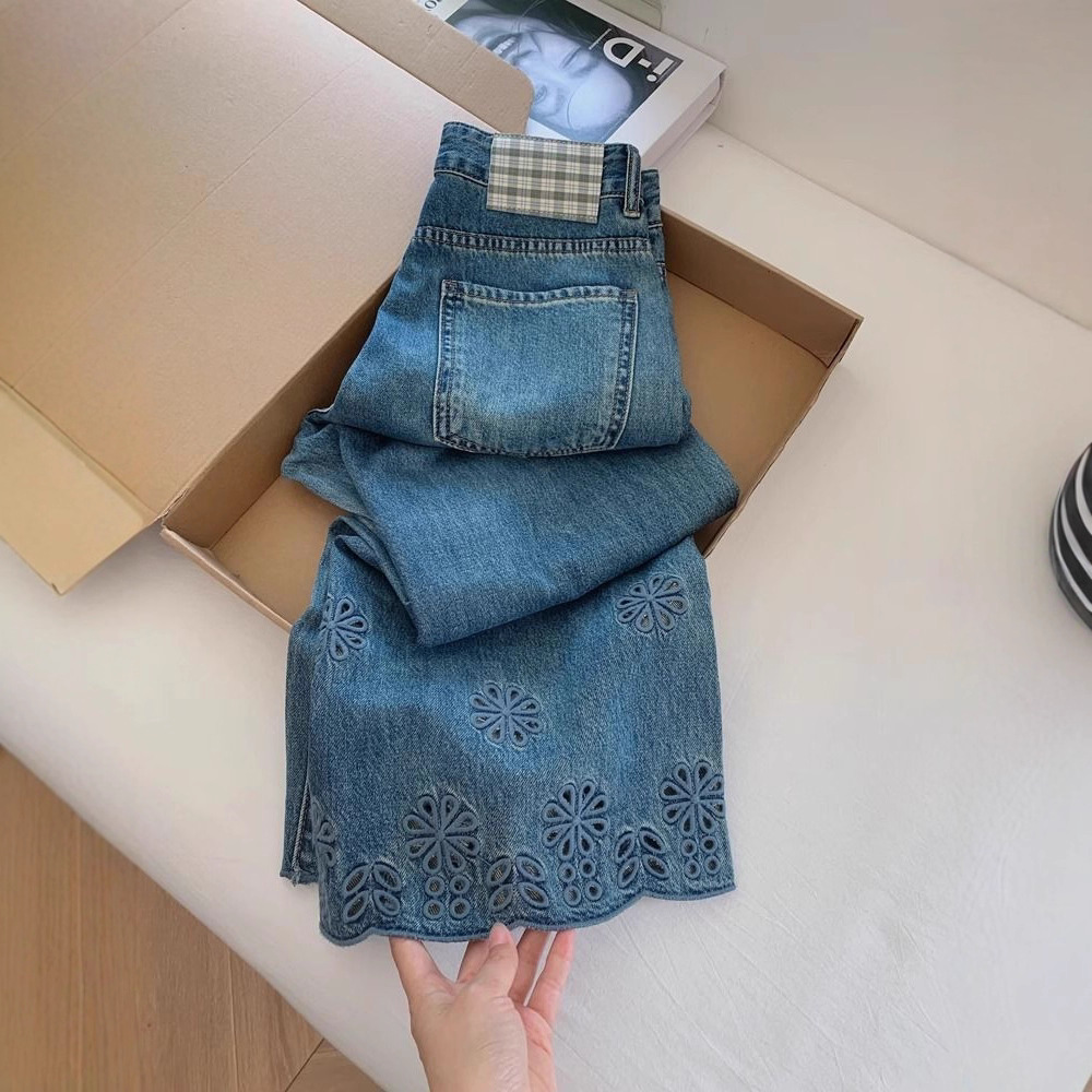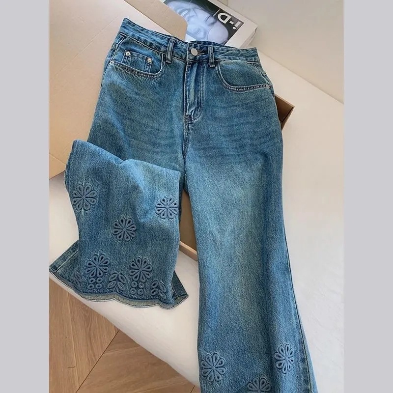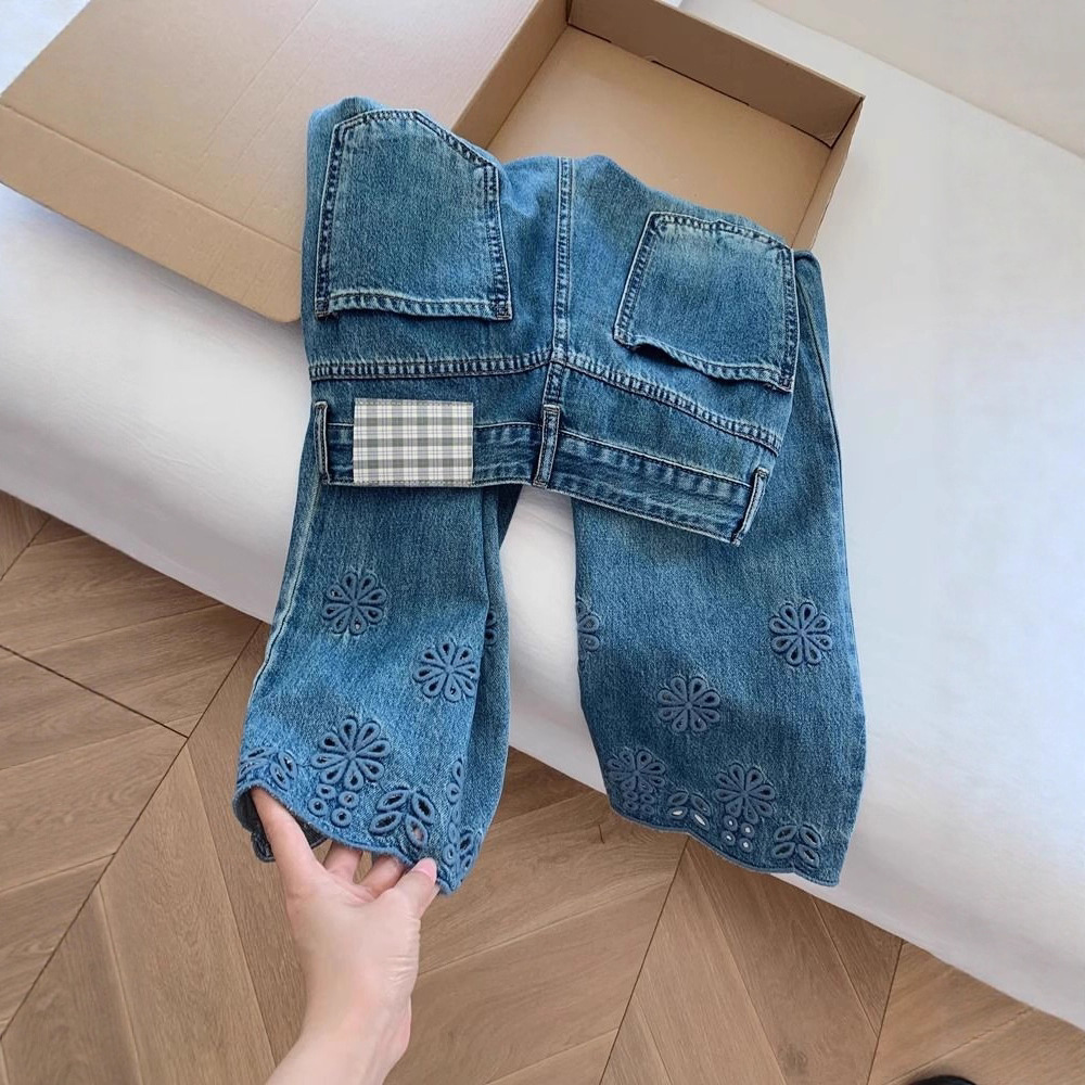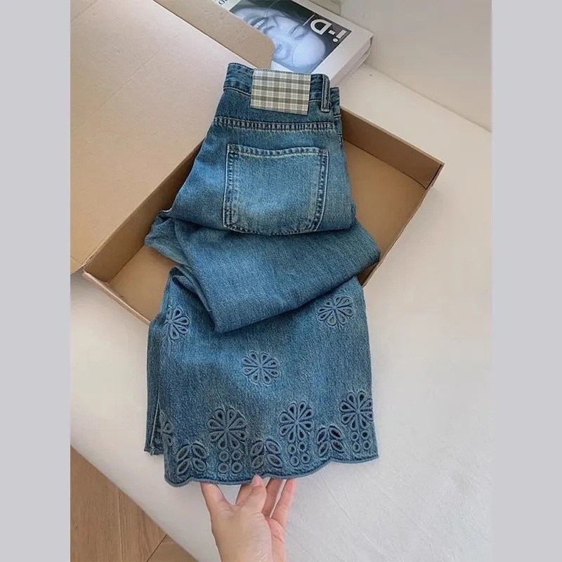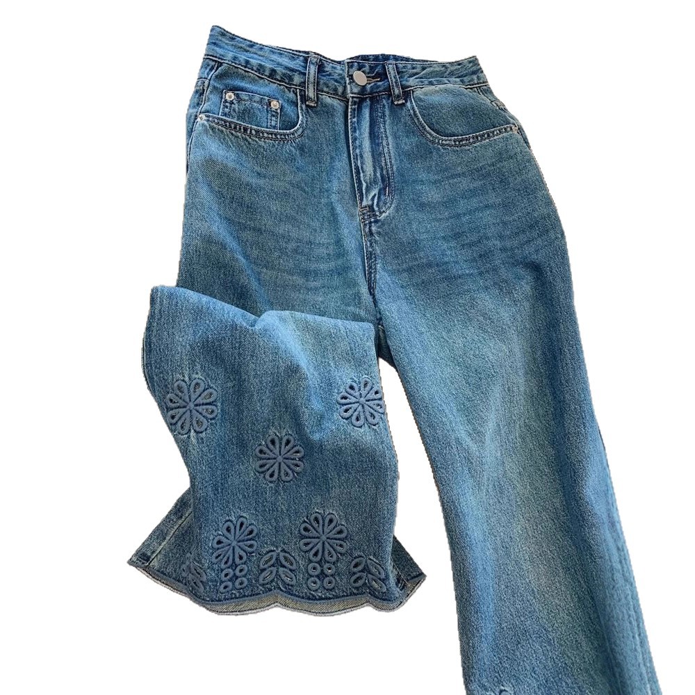 Главная страница > Новые синие узкие прямые джинсы с полой вышивкой в китайском стиле, широкие свободные укороченные брюки для женщин