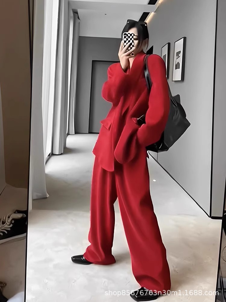 Черная шифоновая рубашка + красный широкий брючный костюм