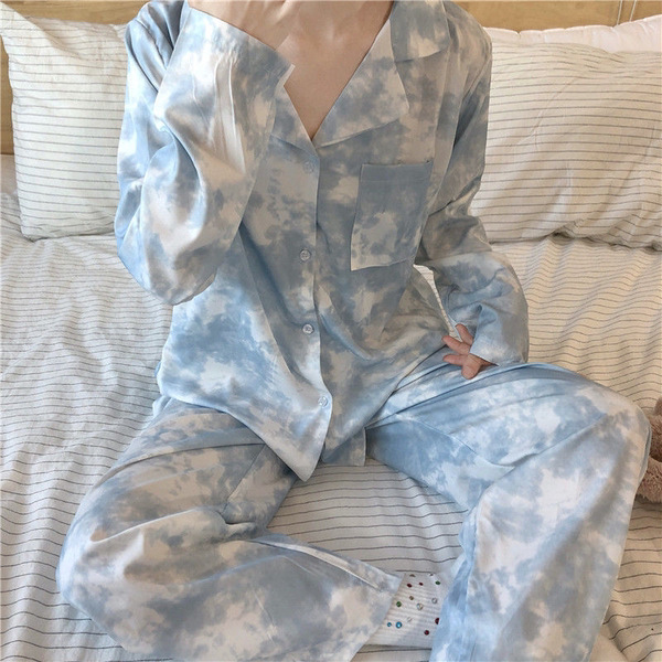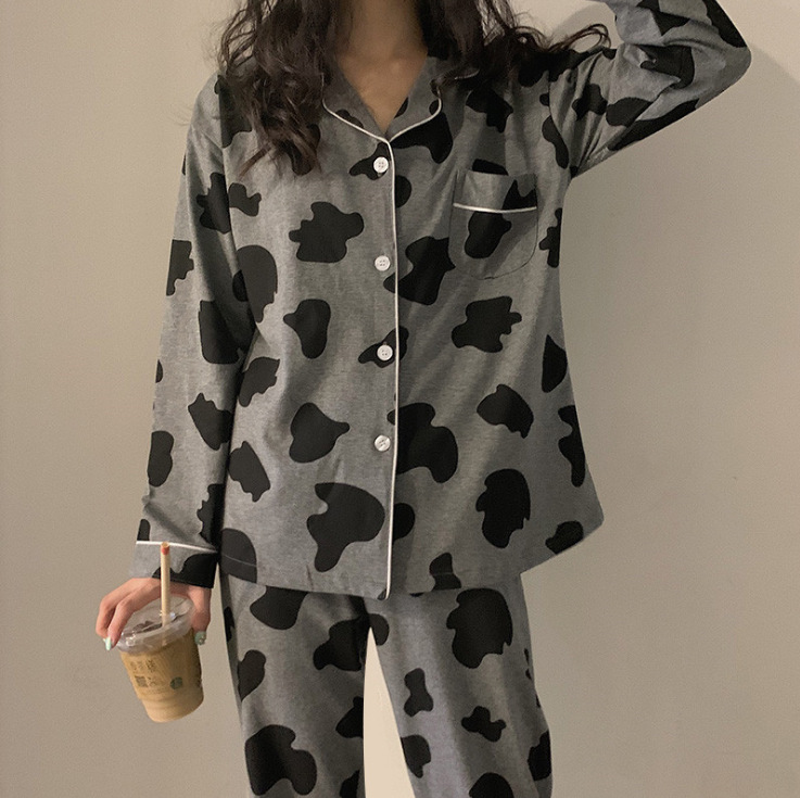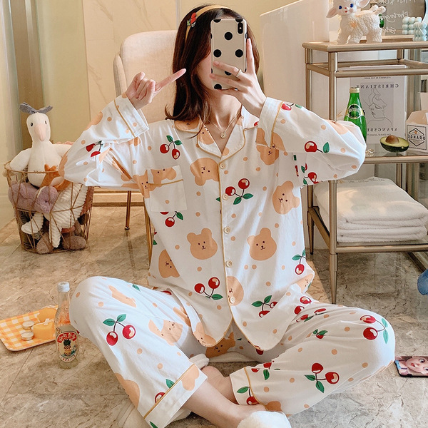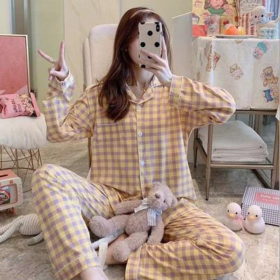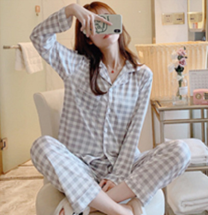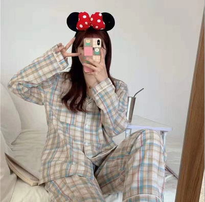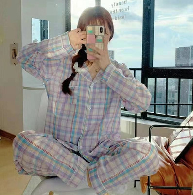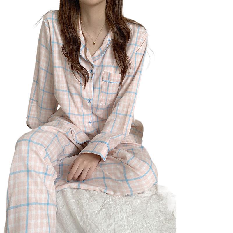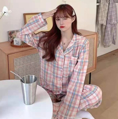 Главная страница > Пижама женская весна-осень кардиган с длинным рукавом костюм в клетку пудровый корейский стиль сладкая свежесть Студенческая Домашняя одежда свободный костюм