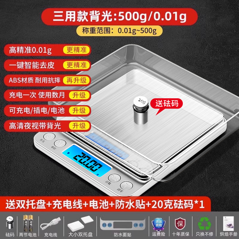 Перезаряжаемая трехразовая модель, вес 500 г/0,01 г + чаша для весов + двойной поднос + мерный стакан + водонепроницаемая наклейка