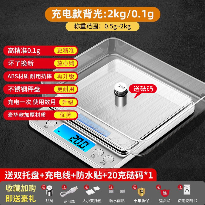 Перезаряжаемая трехразовая модель, градуированная чаша 2 кг/0,1 г + двойной поддон + мерный стакан + водонепроницаемая наклейка Bada Hao
